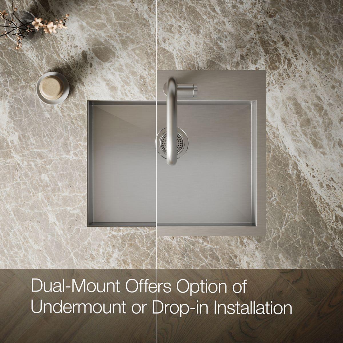 The distinctive, modern design of the Vault dual-mount sink lends a contemporary vibe to your kitchen. Handcrafted from durable stainless steel, this sink features a single bowl with tightly angled corners to maximize basin space and a sloped bottom that helps with draining and cleanup. An engineered sound-absorption system significantly reduces disposal and dishwashing noise. Vault's ultra-flat rim makes it easy to wipe from the counter directly into the sink.