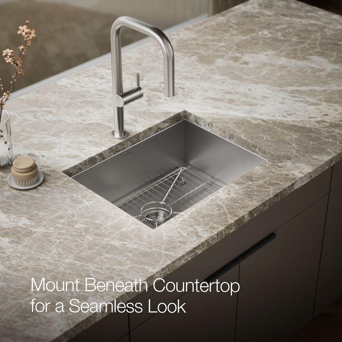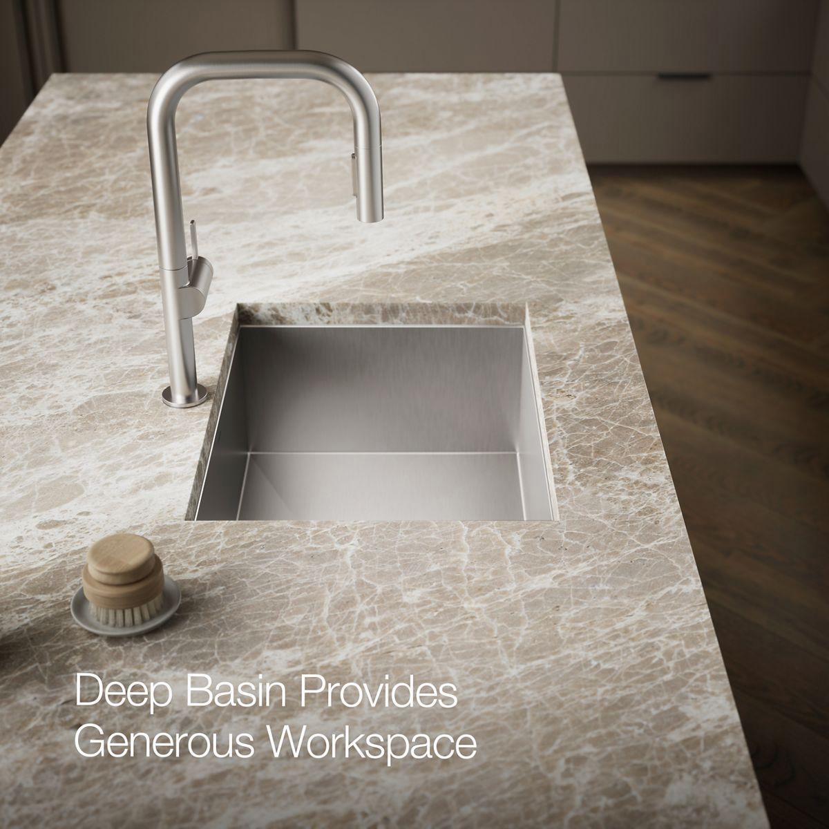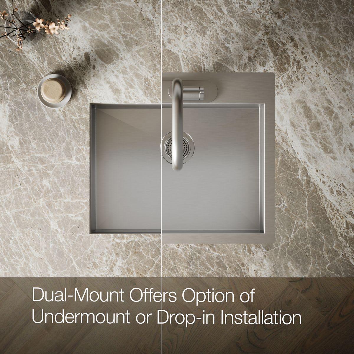 The distinctive, modern design of the Vault dual-mount sink lends a contemporary vibe to your kitchen. Handcrafted from durable stainless steel, this sink features a single bowl with tightly angled corners to maximize basin space and a sloped bottom that helps with draining and cleanup. An engineered sound-absorption system significantly reduces disposal and dishwashing noise. Vault's ultra-flat rim makes it easy to wipe from the counter directly into the sink.