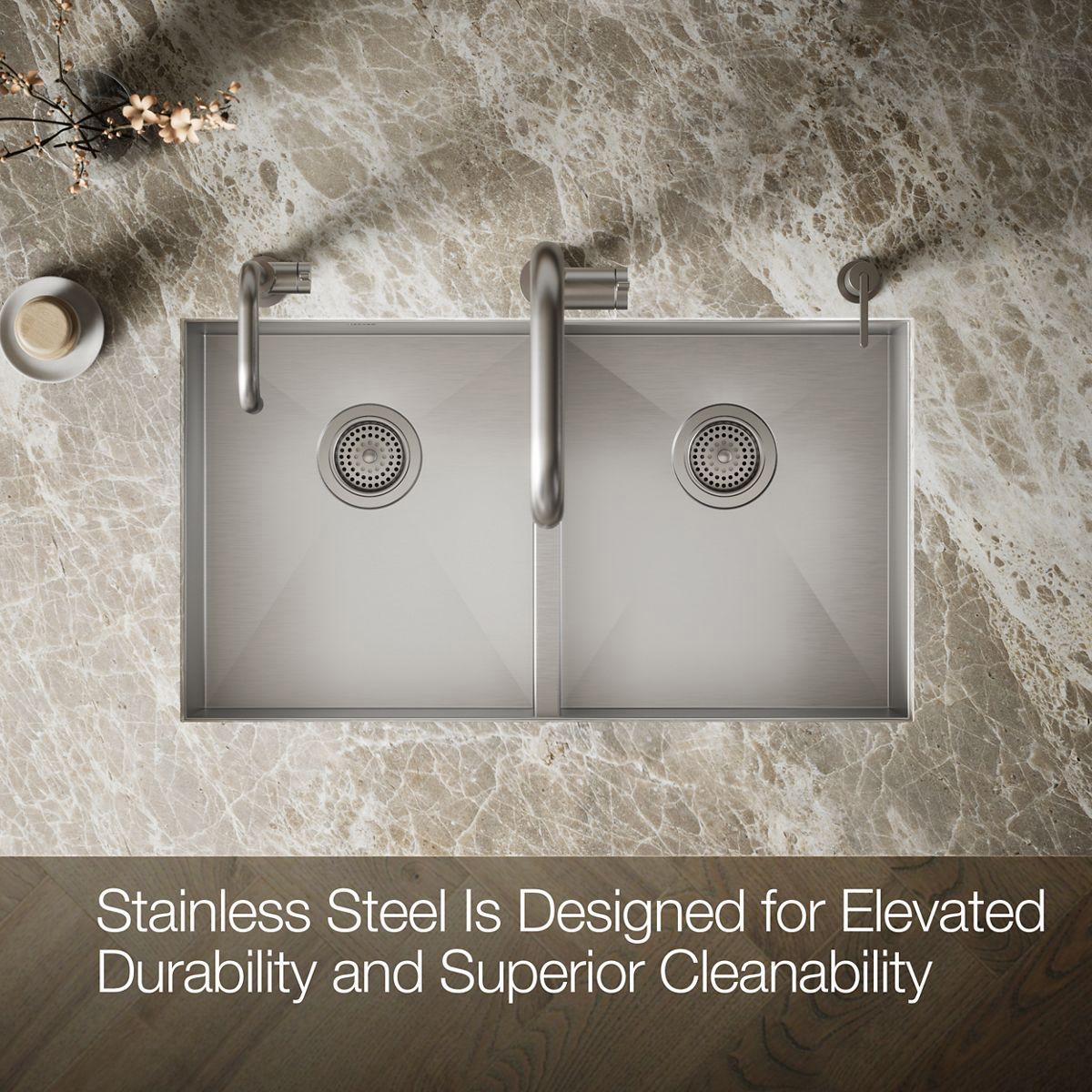 The distinctive, modern design of the Vault sink lends a contemporary vibe to your kitchen. Handcrafted from durable stainless steel, this undermount sink features a lowered divider, tightly angled corners to maximize basin space, and a sloped bottom that helps with draining and cleanup. An engineered sound-absorption system significantly reduces disposal and dishwashing noise.