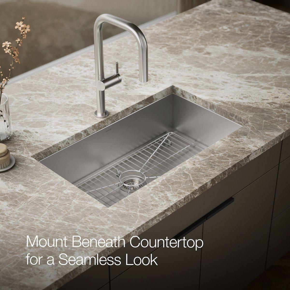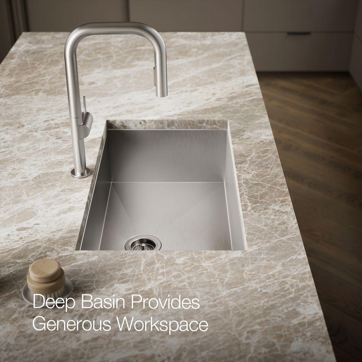 The distinctive, modern design of the Vault dual-mount sink lends a contemporary vibe to your kitchen. This spacious single bowl, handcrafted from stainless steel, is ideal for soaking and washing large pans. It features tightly angled corners to maximize basin space and a sloped bottom that helps with draining and cleanup. An engineered sound-absorption system significantly reduces disposal and dishwashing noise. Vault's ultra-flat rim makes it easy to wipe from the counter directly into the sink.