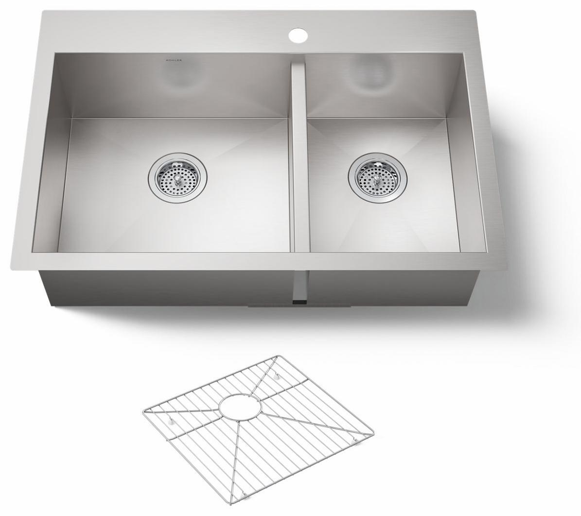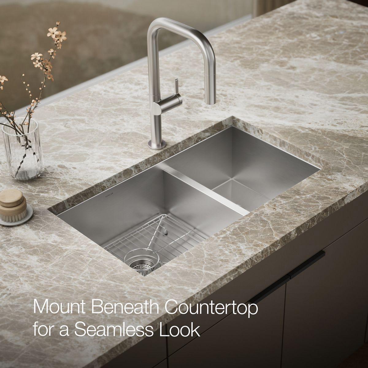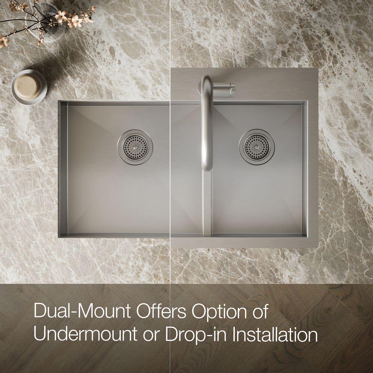 The distinctive, modern design of the Vault dual-mount sink lends a contemporary vibe to your kitchen. Handcrafted from durable stainless steel, the large/medium bowls allow you to keep clean and dirty dishes separate while offering plenty of room for oversize pots and pans. The sink features tightly angled corners to maximize basin space and a sloped bottom that helps with draining and cleanup. A slightly lowered divide in between the basins helps prevent water from flowing into the countertop.