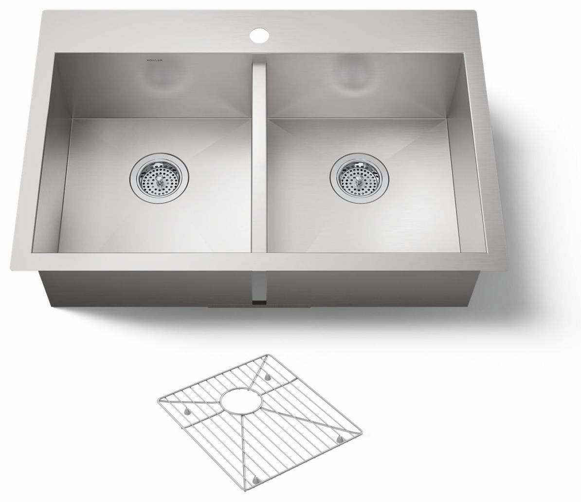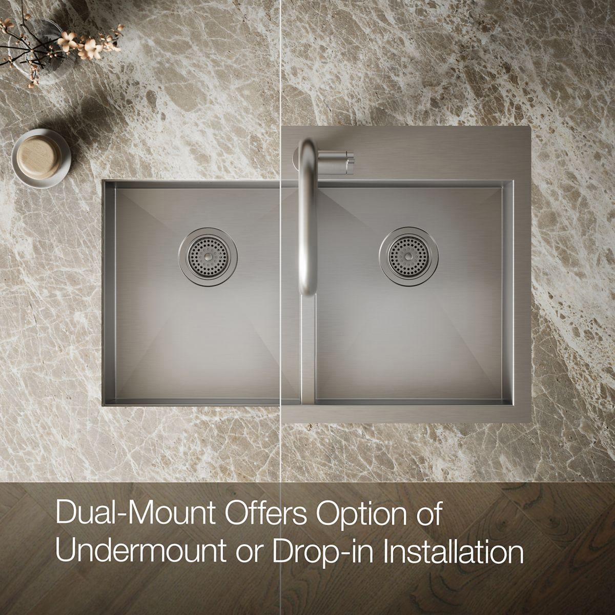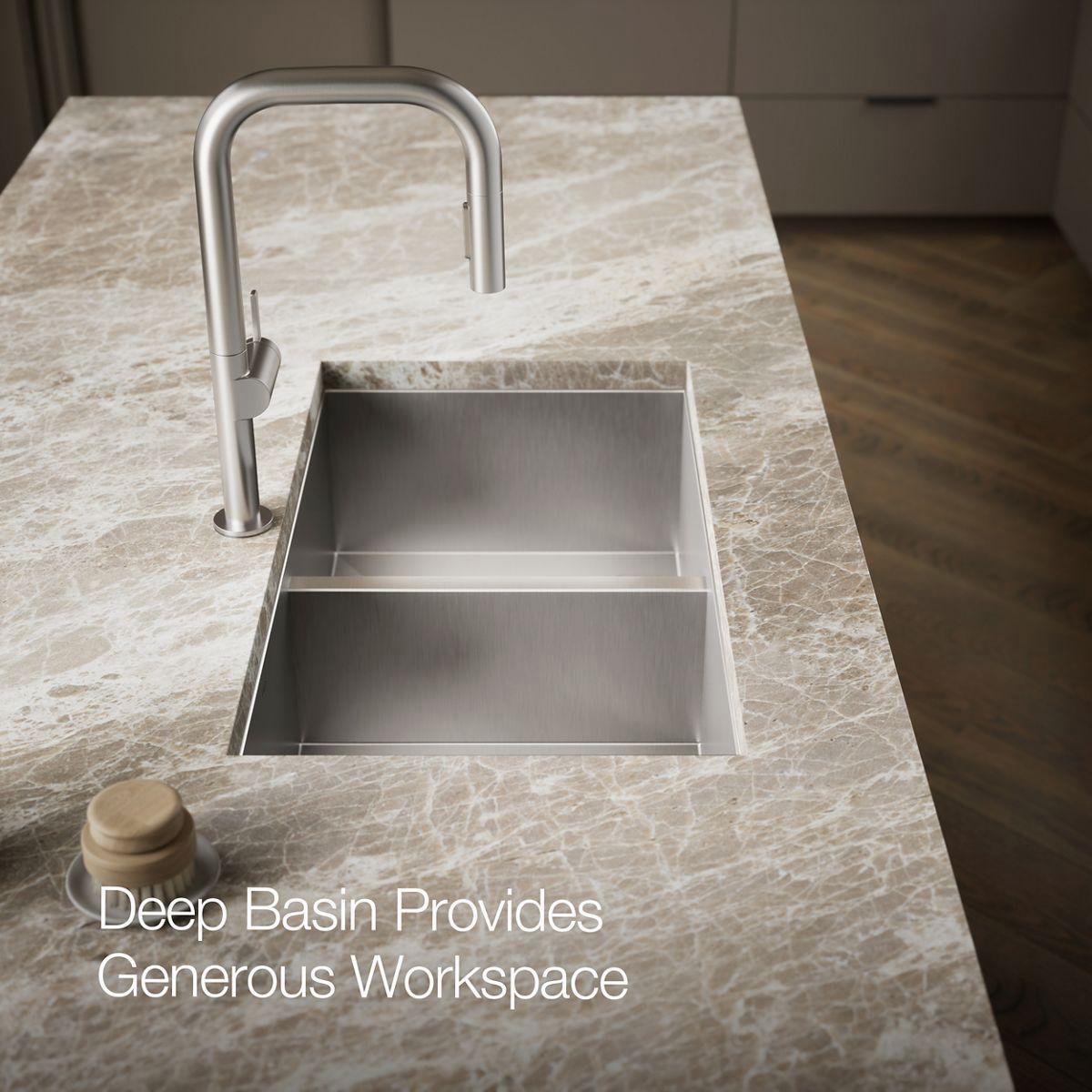 The distinctive, modern design of the Vault sink lends a contemporary vibe to your kitchen. Handcrafted from durable stainless steel, this dual-mount sink features a lowered divider, tightly angled corners to maximize basin space, and a sloped bottom that helps with draining and cleanup. An engineered sound-absorption system significantly reduces disposal and dishwashing noise. Vault's ultra-flat rim makes it easy to wipe from the counter directly into the sink.