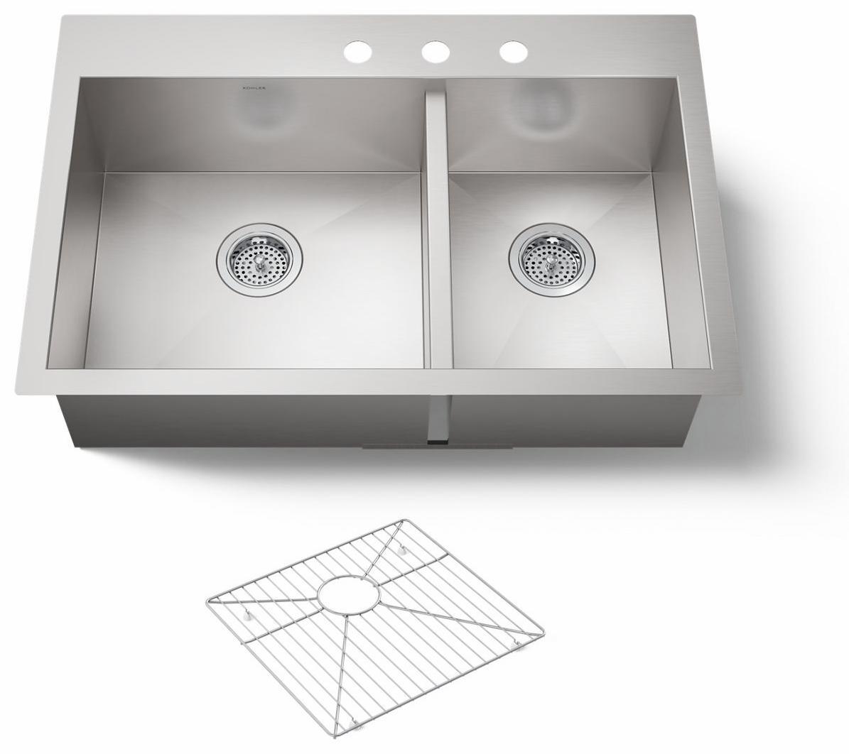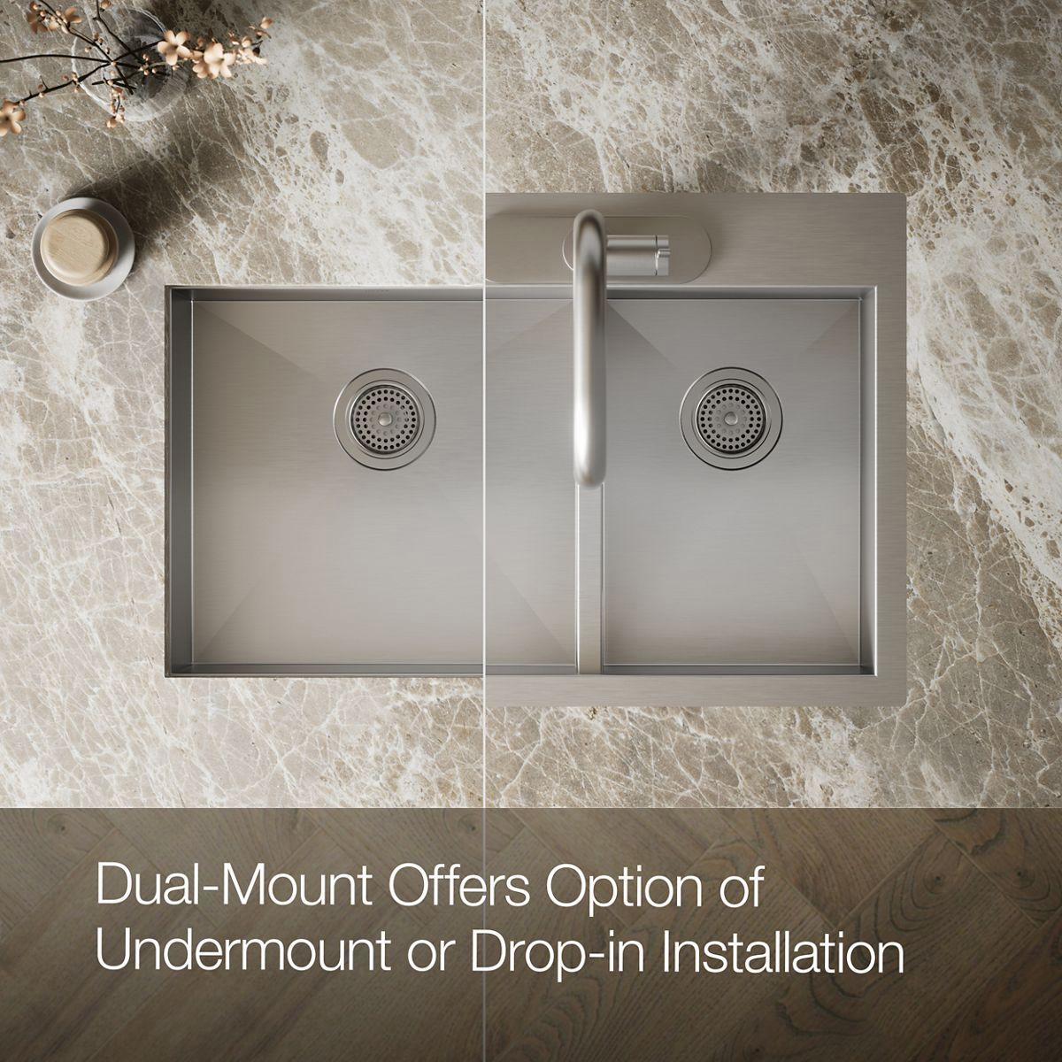 The distinctive, modern design of the Vault dual-mount sink lends a contemporary vibe to your kitchen. Handcrafted from durable stainless steel, the large/medium bowls allow you to keep clean and dirty dishes separate while offering plenty of room for oversize pots and pans. The sink features tightly angled corners to maximize basin space and a sloped bottom that helps with draining and cleanup. A slightly lowered divide in between the basins helps prevent water from flowing into the countertop.