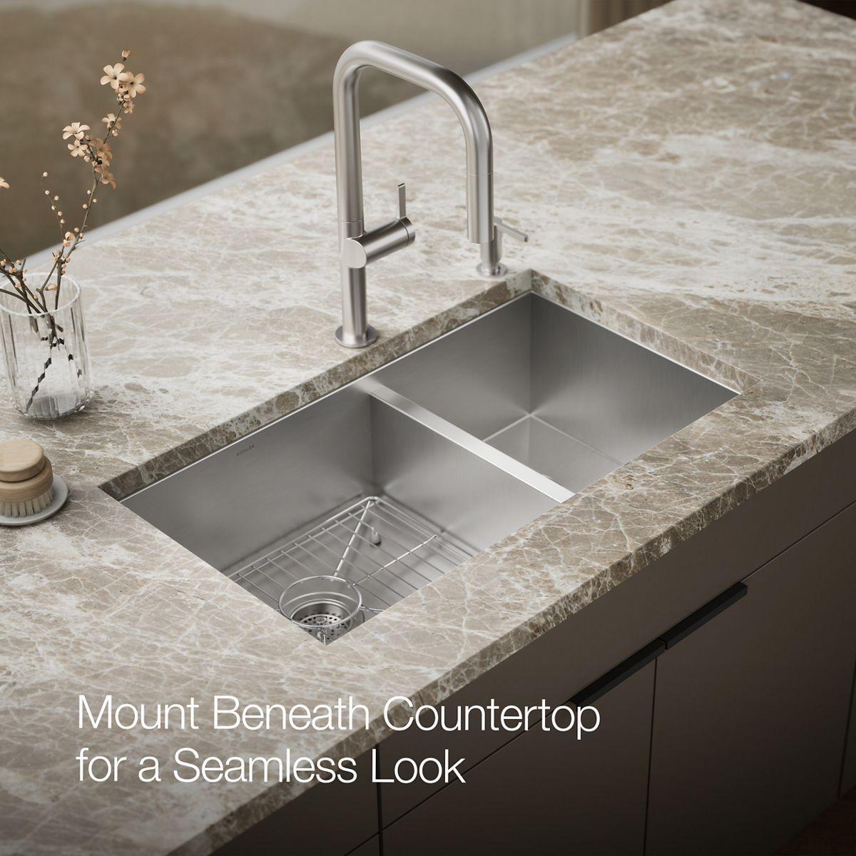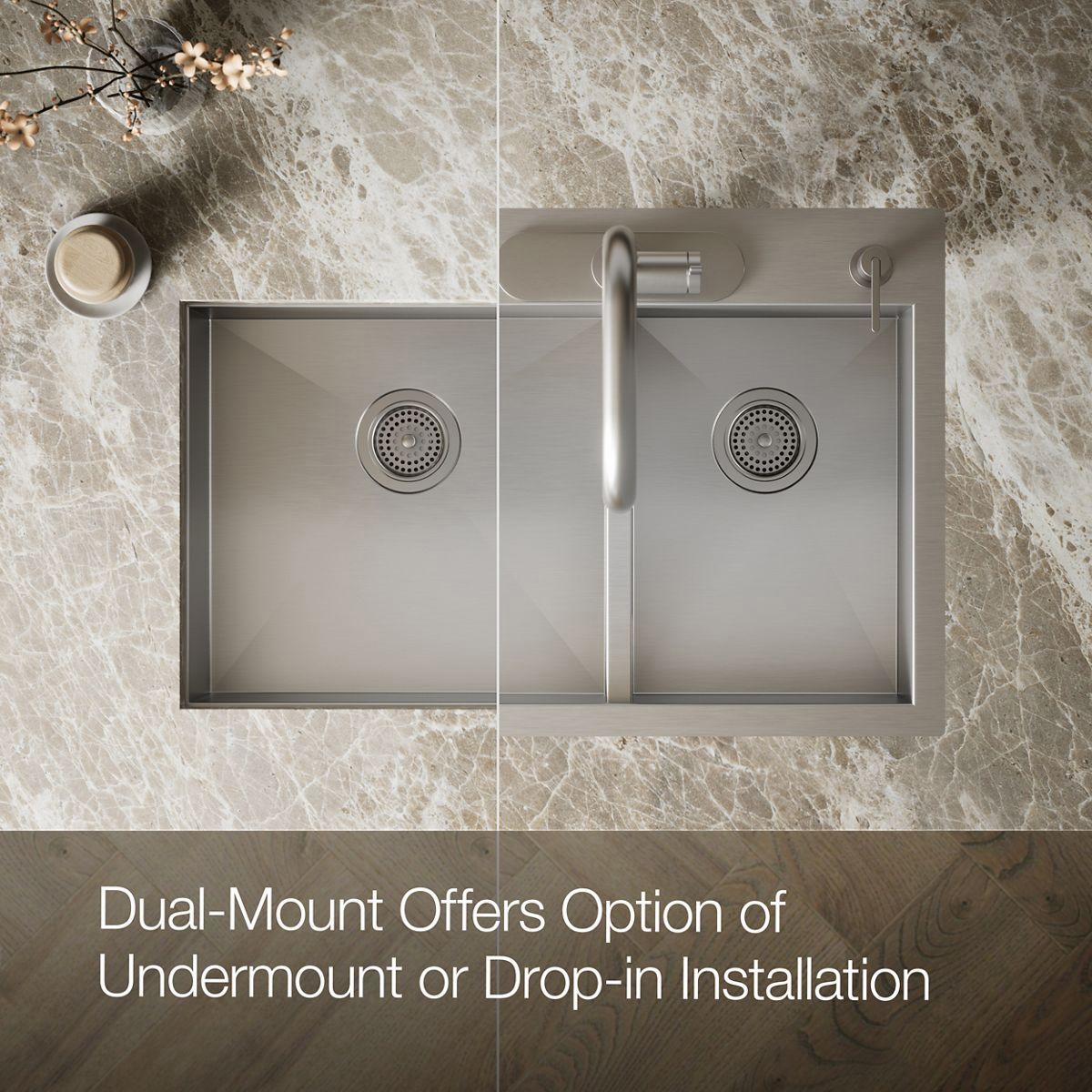 The distinctive, modern design of the Vault dual-mount sink lends a contemporary vibe to your kitchen. Handcrafted from durable stainless steel, the large/medium bowls allow you to keep clean and dirty dishes separate while offering plenty of room for oversize pots and pans. The sink features tightly angled corners to maximize basin space and a sloped bottom that helps with draining and cleanup. A slightly lowered divide in between the basins helps prevent water from flowing into the countertop.