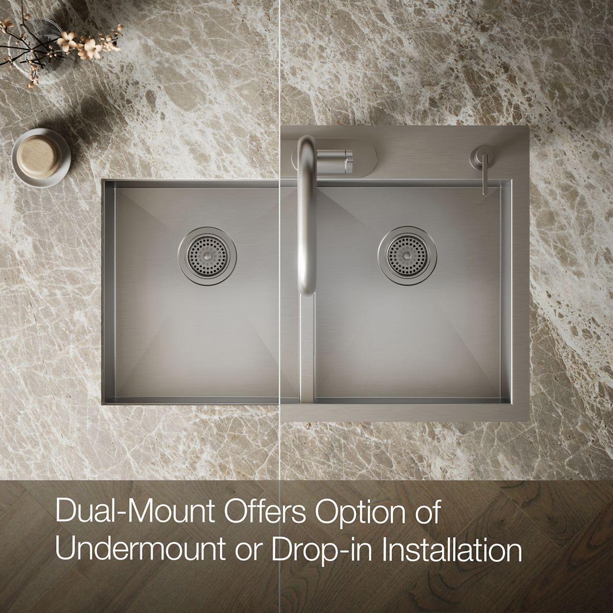 The distinctive, modern design of the Vault sink lends a contemporary vibe to your kitchen. Handcrafted from stainless steel, this dual-mount sink features a lowered divider, tightly angled corners to maximize basin space, and a sloped bottom that helps with draining and cleanup. An engineered sound-absorption system significantly reduces disposal and dishwashing noise. Vault's ultra-flat rim makes it easy to wipe from the counter directly into the sink.