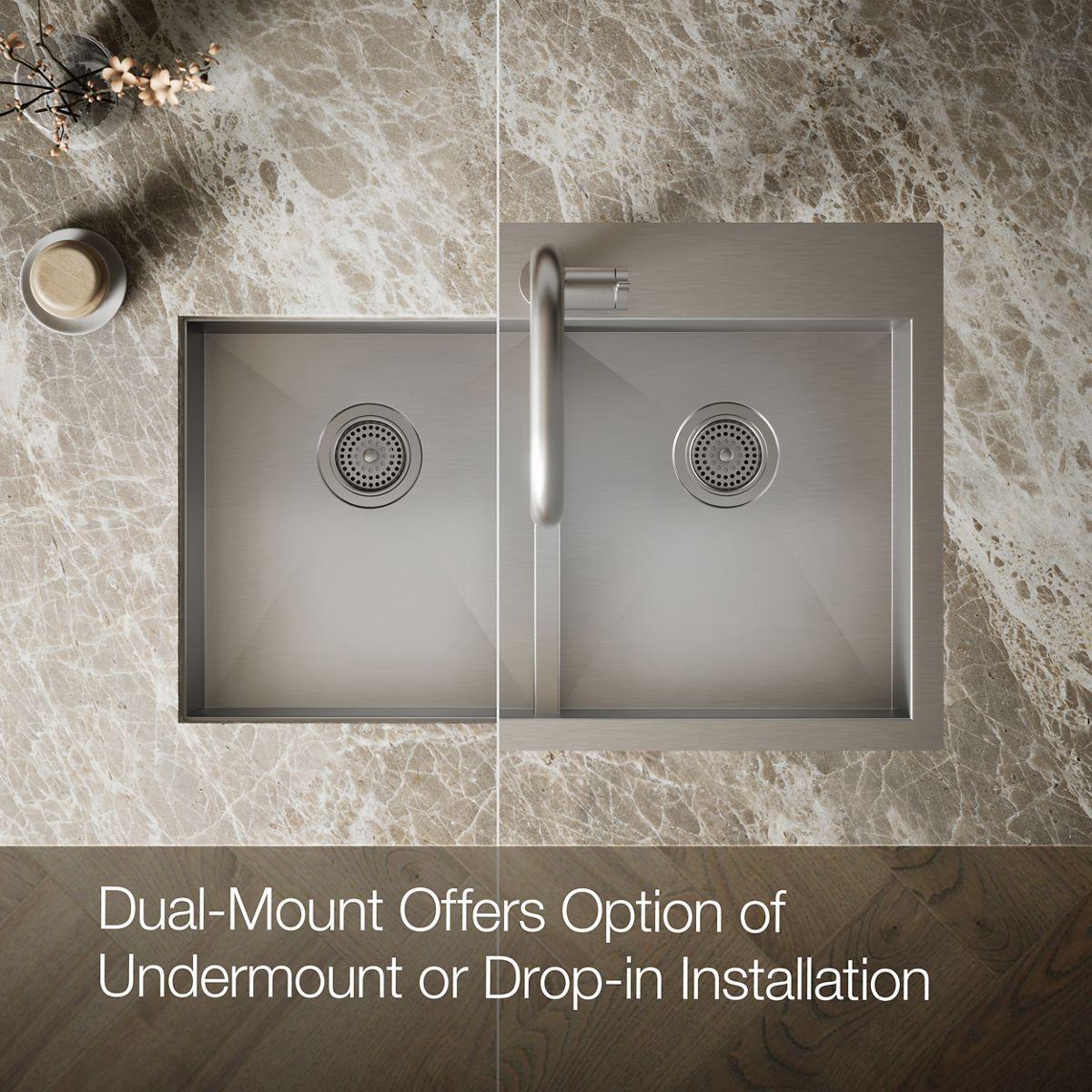 The distinctive, modern design of the Vault dual-mount sink lends a contemporary vibe to your kitchen. Handcrafted from stainless steel, this sink features tightly angled corners to maximize basin space and lowered divider for freedom of movement between basins. When installed as a top-mount sink, Vault offers a low-profile rim that makes it easier to wipe from the countertop directly into the bowl. An included bottom sink rack fits in either bowl and helps prevent scratches.