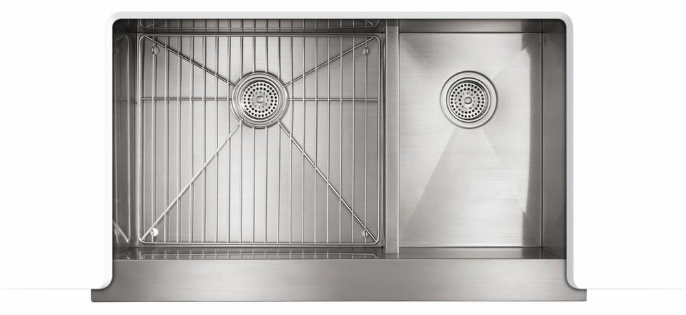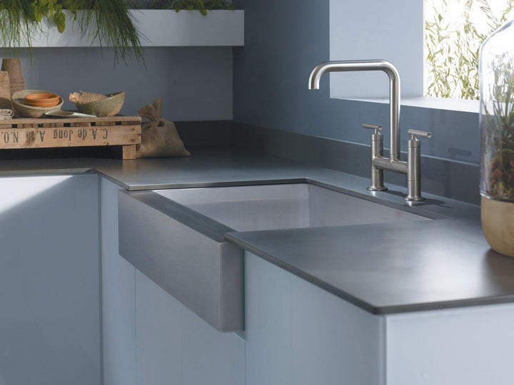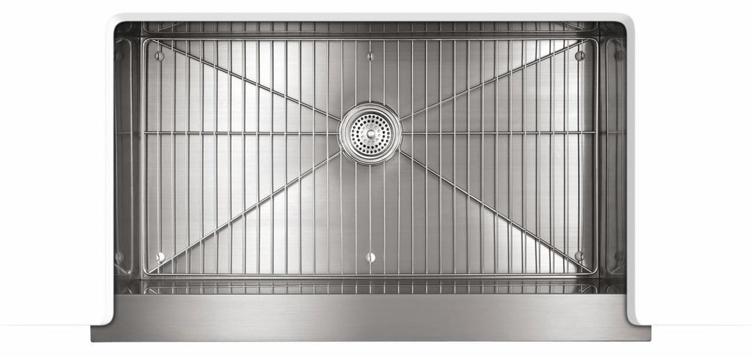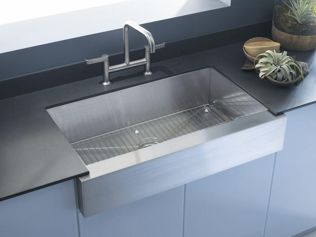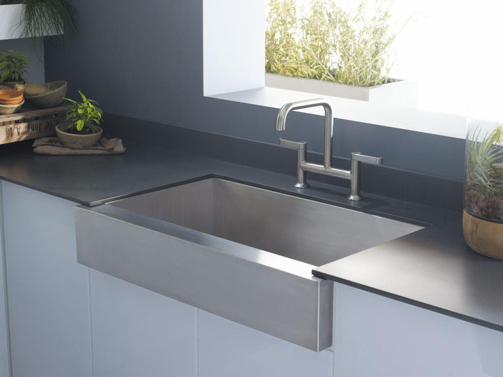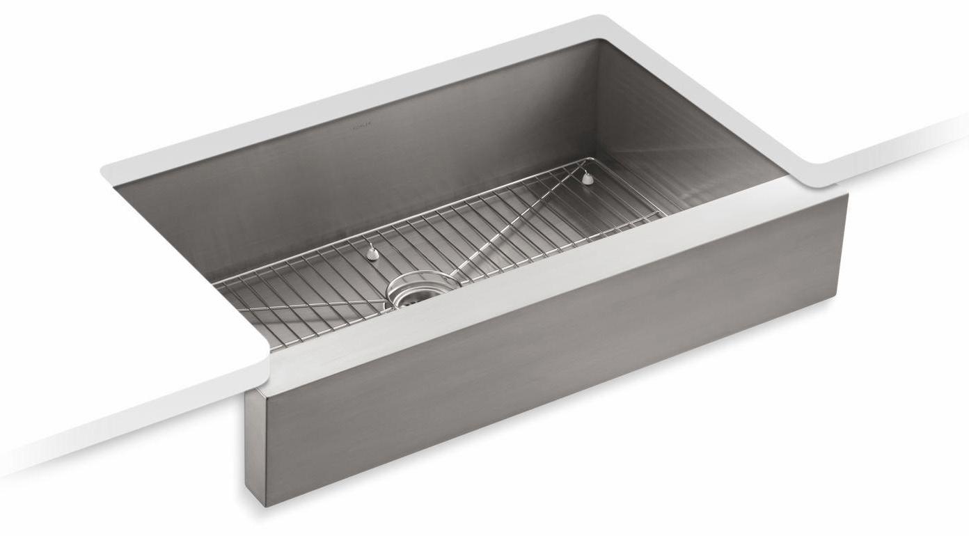 Handcrafted from stainless steel, Vault brings bold new style to the traditional farmhouse sink. The single-bowl design features tightly angled corners to maximize basin space, and an included bottom sink rack helps prevent scratches. Due to its shortened apron, this sink does not require a special apron-front cabinet, making it easy to install with most new or existing 36-inch cabinetry. The Self-Trimming® design requires only a simple rough cut, overlapping the cabinet face for beautiful results.