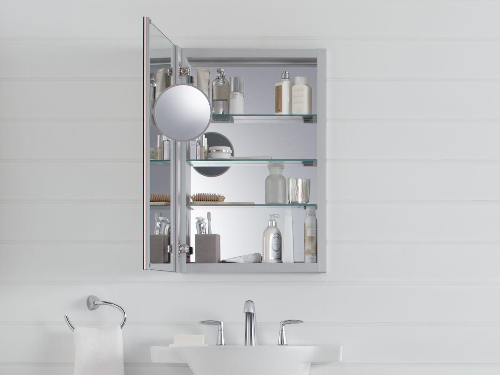 The Verdera medicine cabinet combines an elegant fit and finish with quick, easy installation. A built-in magnifying mirror on the inside of the door is vertically adjustable to accommodate users of varying heights. The door and interior are fully mirrored, and three adjustable glass shelves offer flexible storage. The slow-close door creates a quieter bath environment.