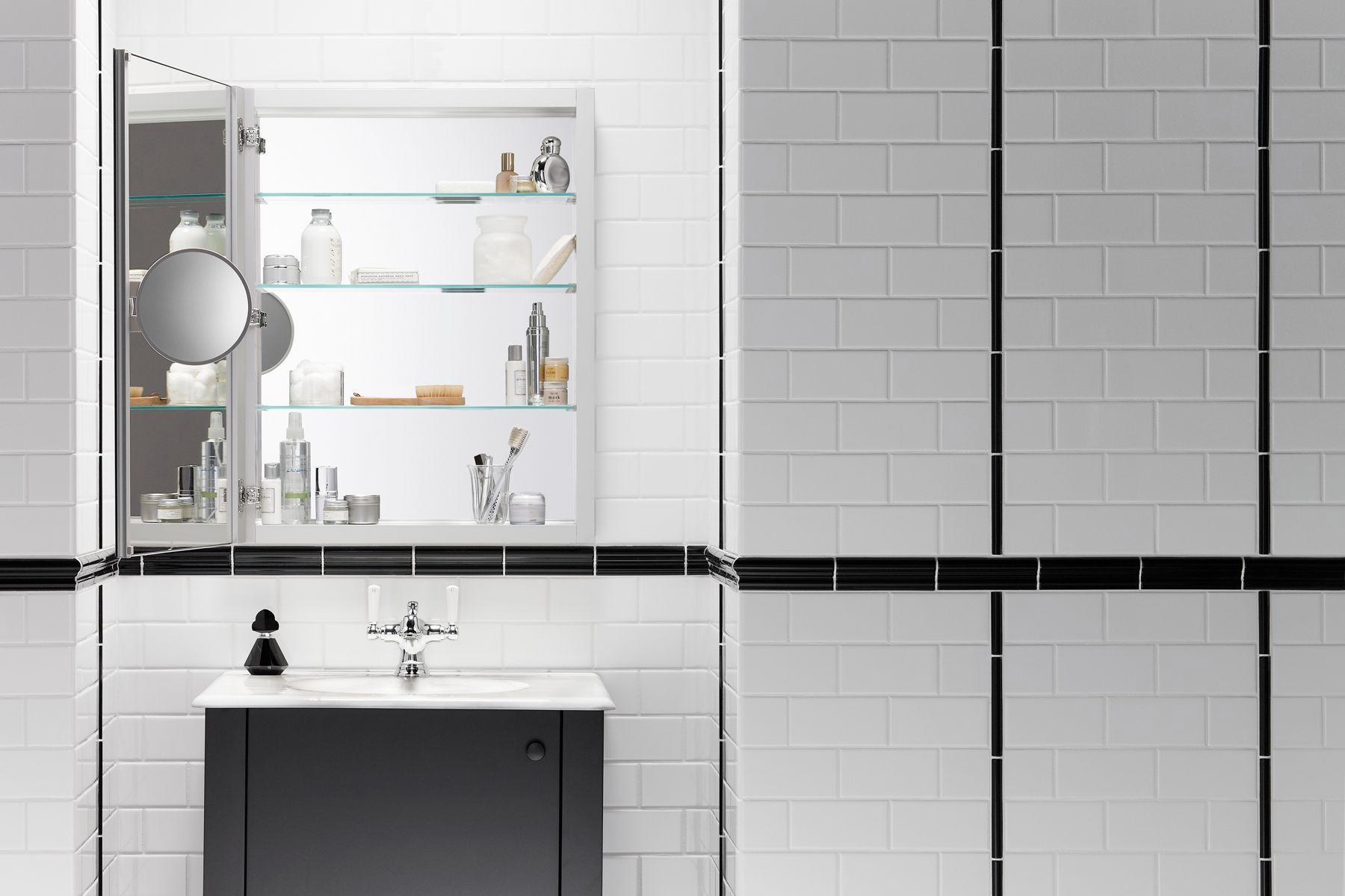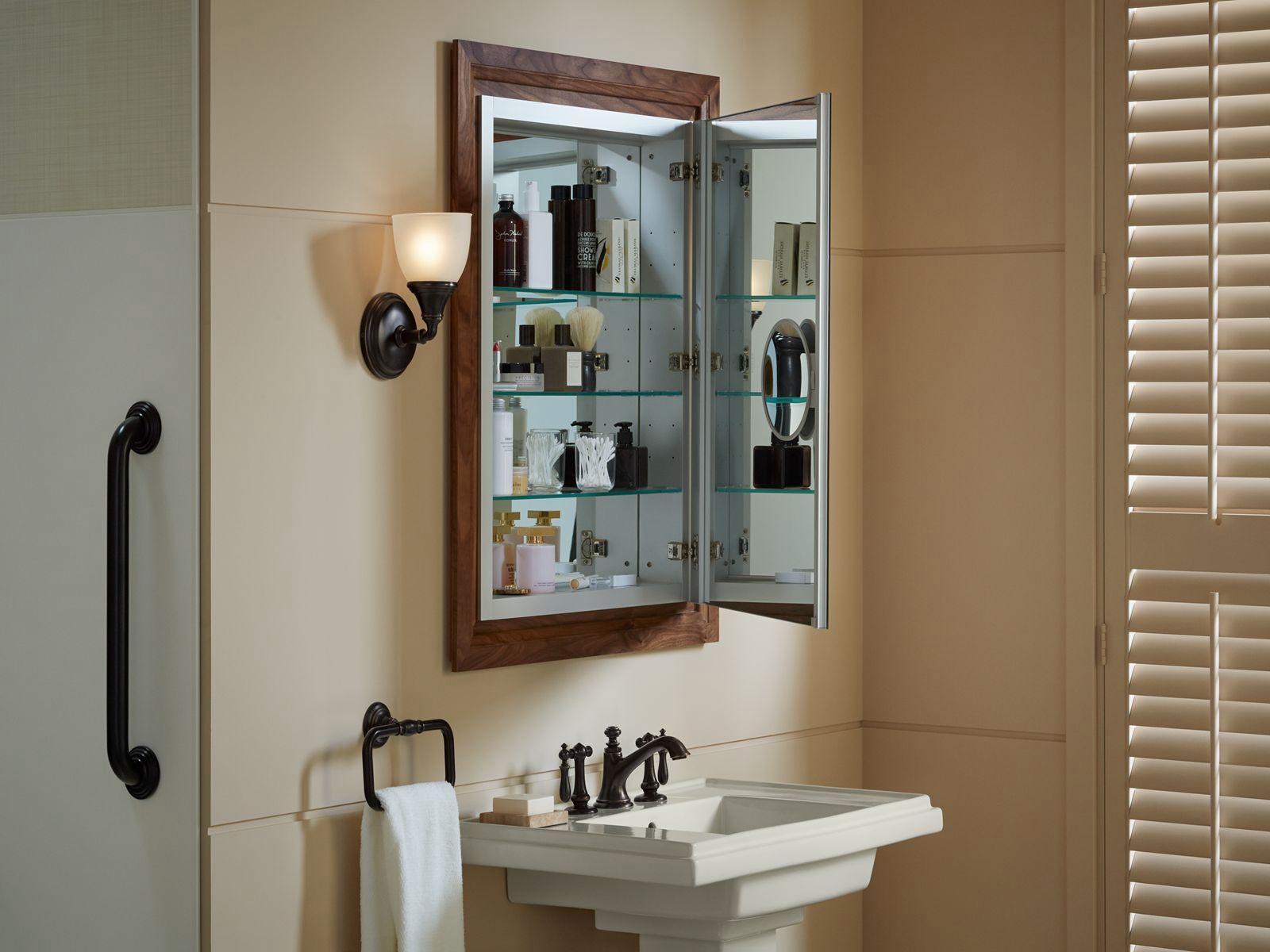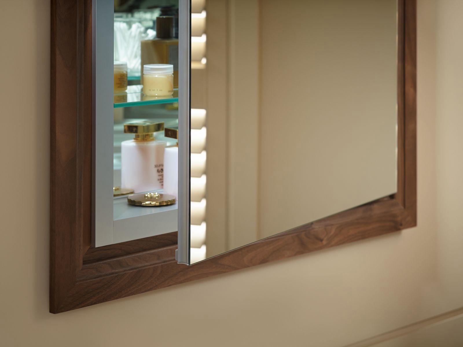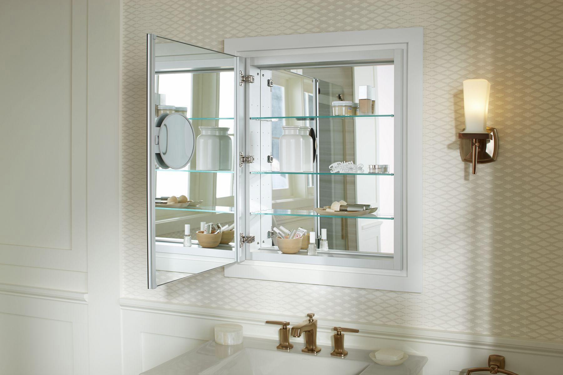 The Verdera medicine cabinet combines an elegant fit and finish with quick, easy installation. A built-in magnifying mirror on the inside of the door is vertically adjustable to accommodate users of varying heights. The door and interior are fully mirrored, and three adjustable glass shelves offer flexible storage. The slow-close door creates a quieter bath environment.
