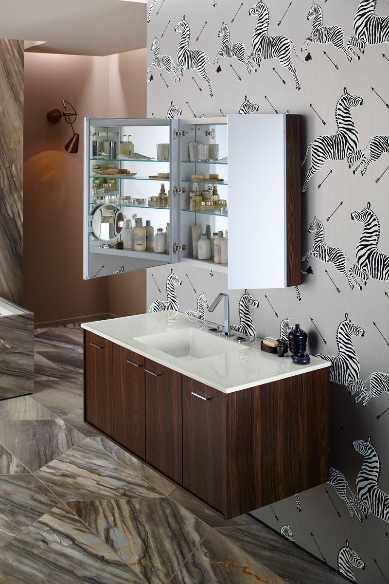 The Verdera medicine cabinet combines an elegant fit and finish with quick, easy installation. Double mirrored doors open to a fully mirrored interior with three adjustable glass shelves. A built-in magnifying mirror on the inside of the door is vertically adjustable to accommodate users of varying heights. Slow-close doors create a quieter bath environment.