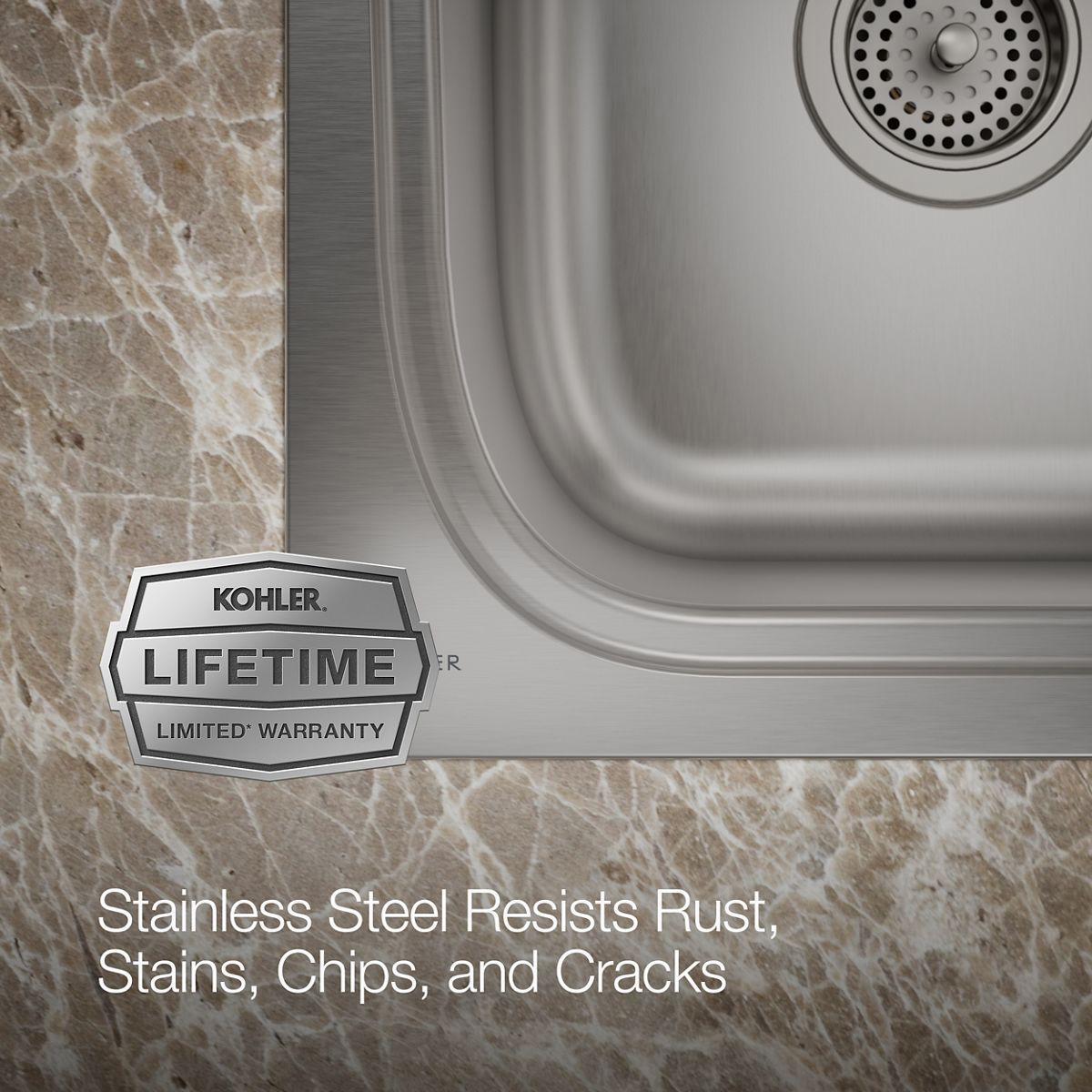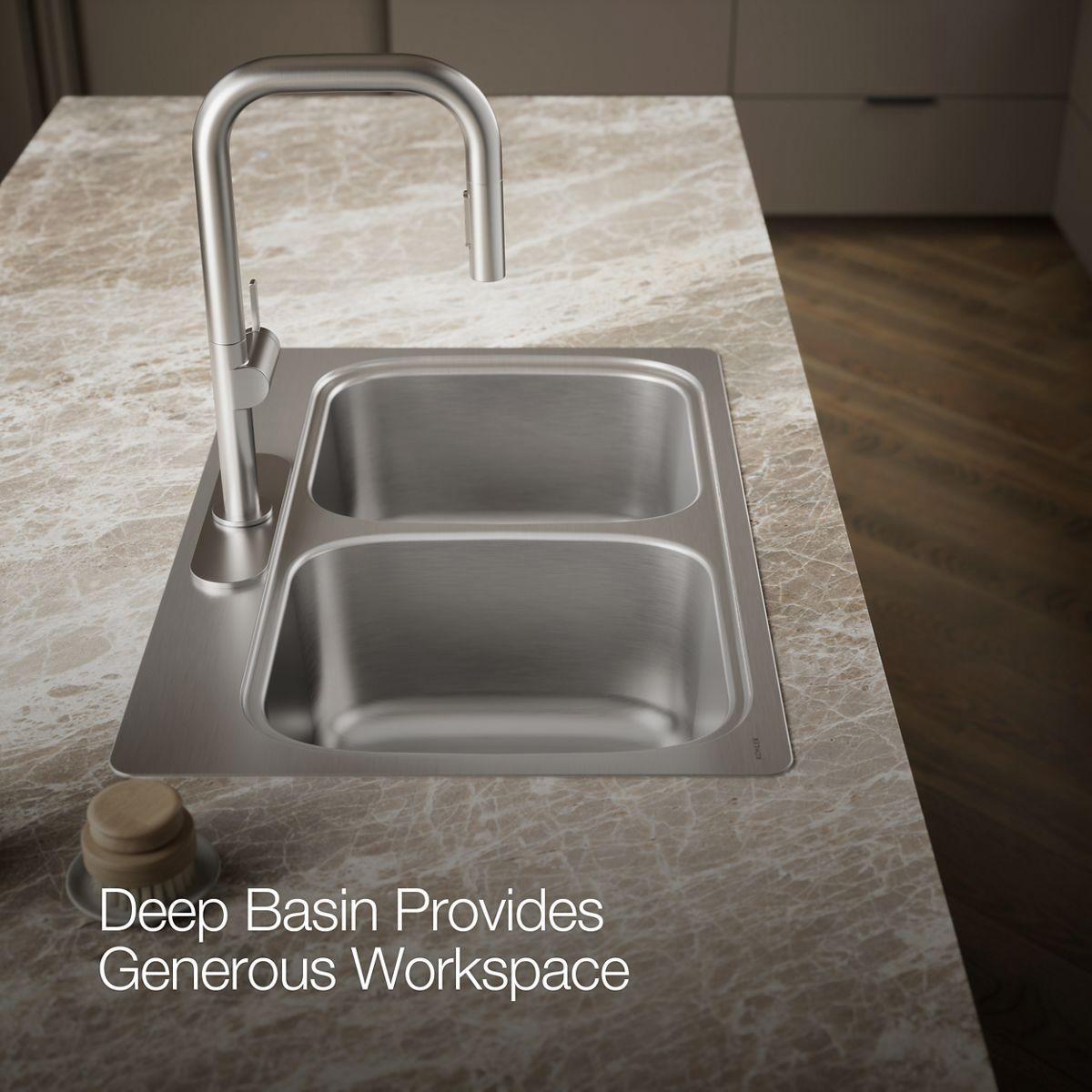 Blending with a wide variety of kitchen styles, this Verse sink features stainless steel construction and a low-profile rim that simplifies cleanup, allowing you to sweep crumbs and liquid into the sink and out of sight. This double-bowl sink features a sound-absorption system that significantly reduces disposal and dishwashing noise.