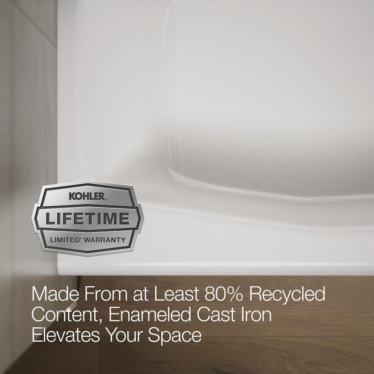 With its functional design and KOHLER styling, the Villager is our most popular bath. The integral apron allows for quick installation, and the bath's durable KOHLER(R) Cast Iron construction ensures years of beauty and reliable performance. This model features a right-hand drain and an extra 4 ledge that provides room for bath supplies. Safeguard slip-resistant surface enhances safety.
