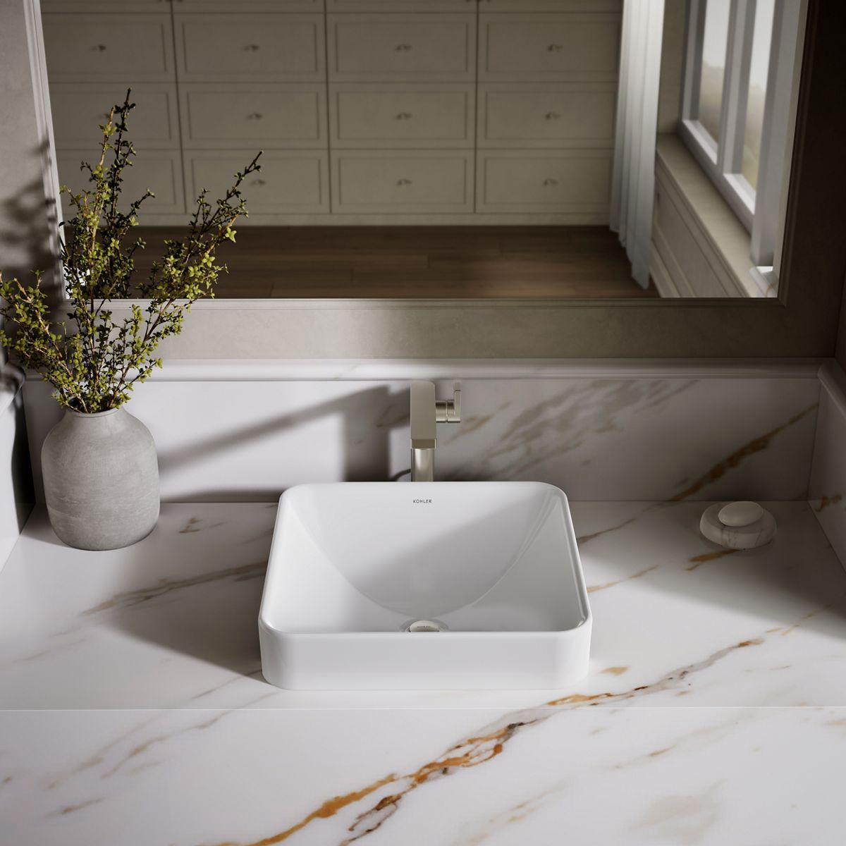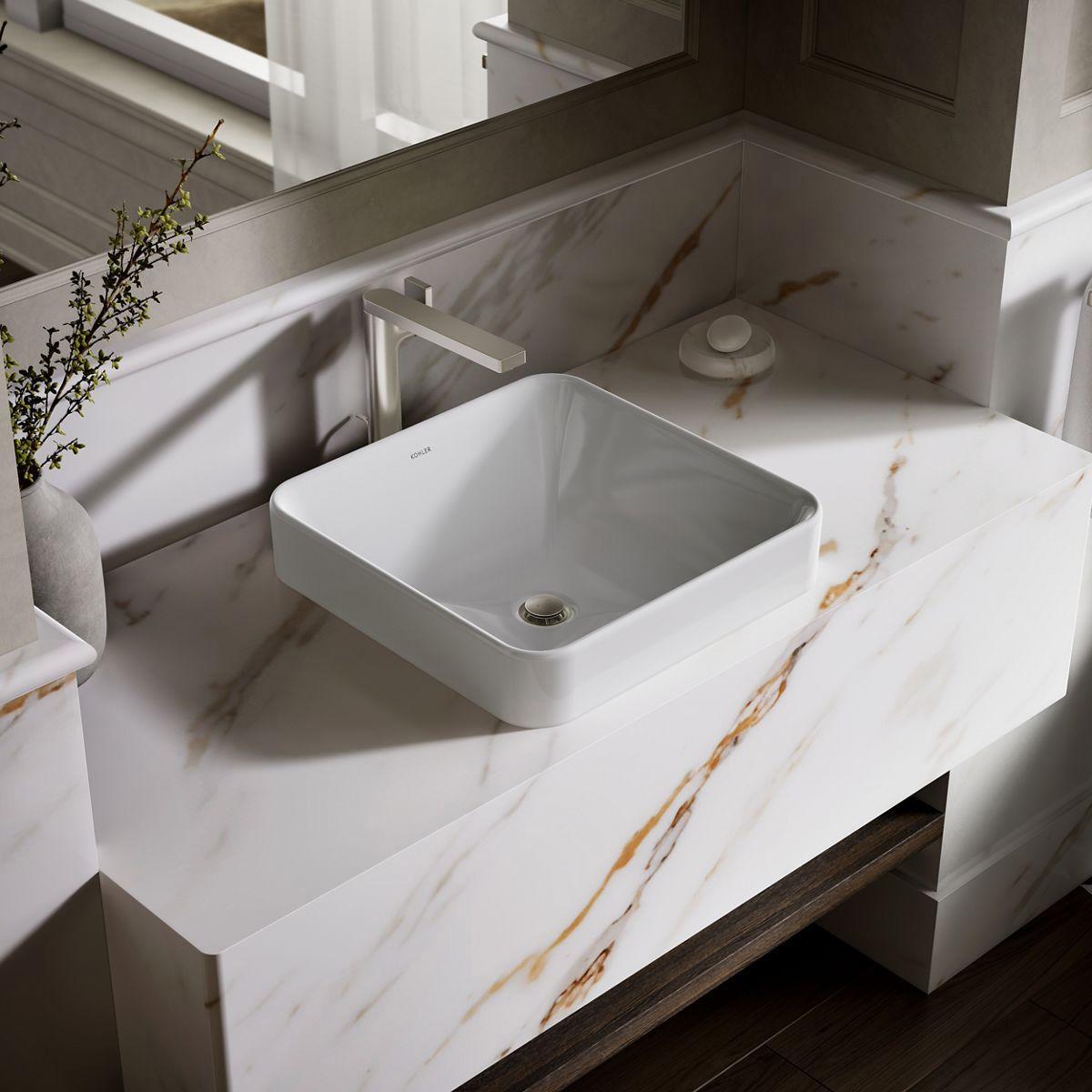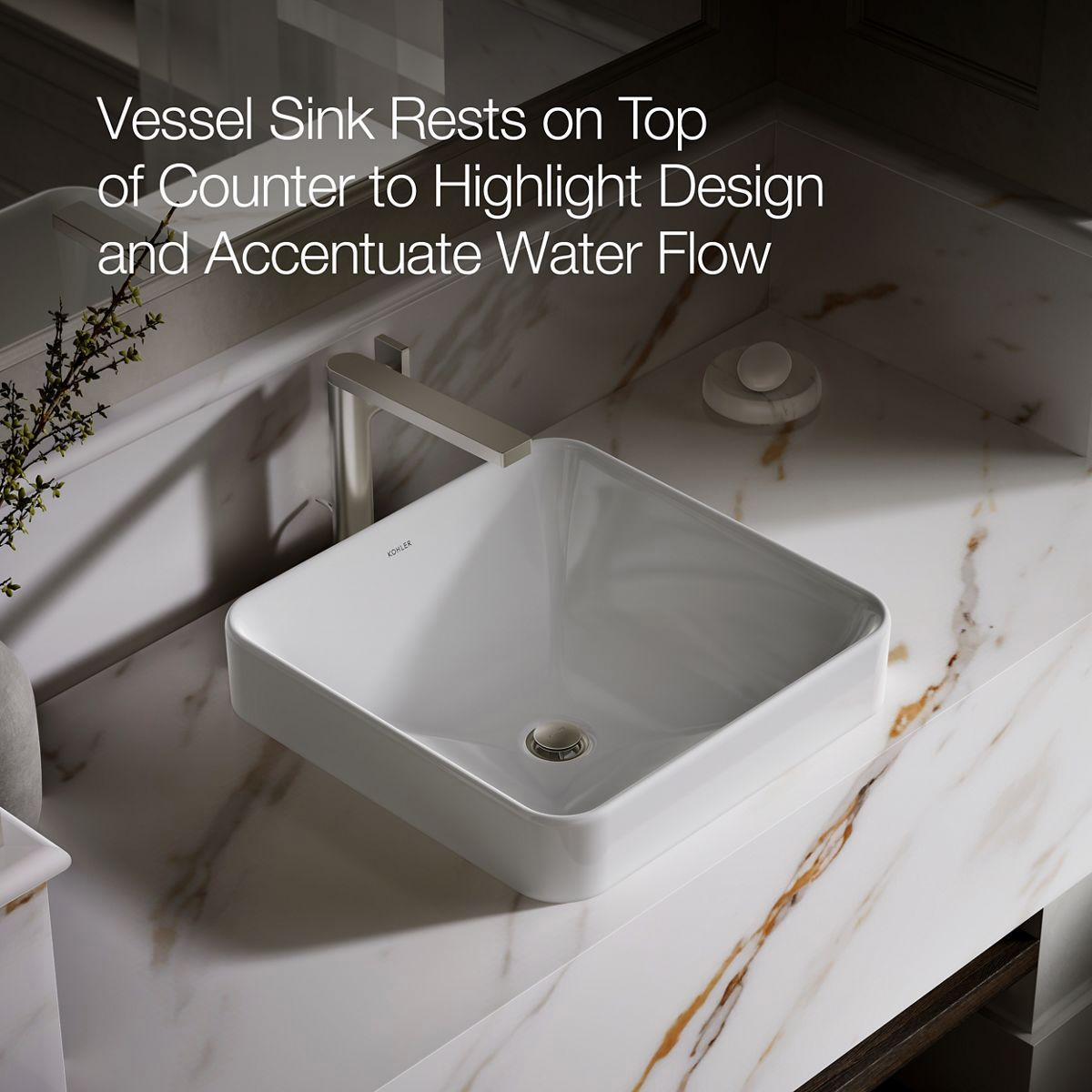 Sleek and contemporary, the Vox Square vessel-style sink features a symmetrical, deep basin and rounded edges in true minimalist fashion. Countertop installation ensures this sink will stand out in your bathroom as a striking focal point.