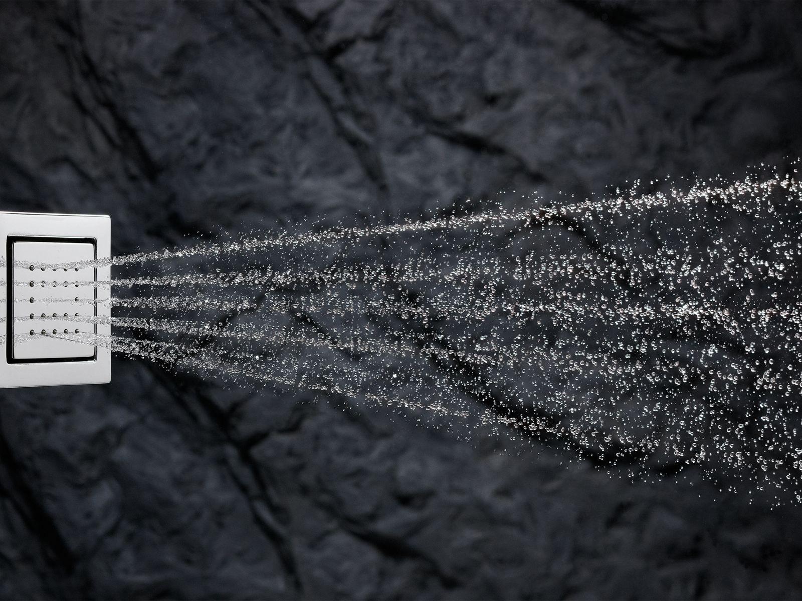WaterTile body sprays lie virtually flush to the wall and can be placed almost anywhere. This square 22-nozzle configuration delivers a high-volume, invigorating spray for a rejuvenating hydrotherapy experience.