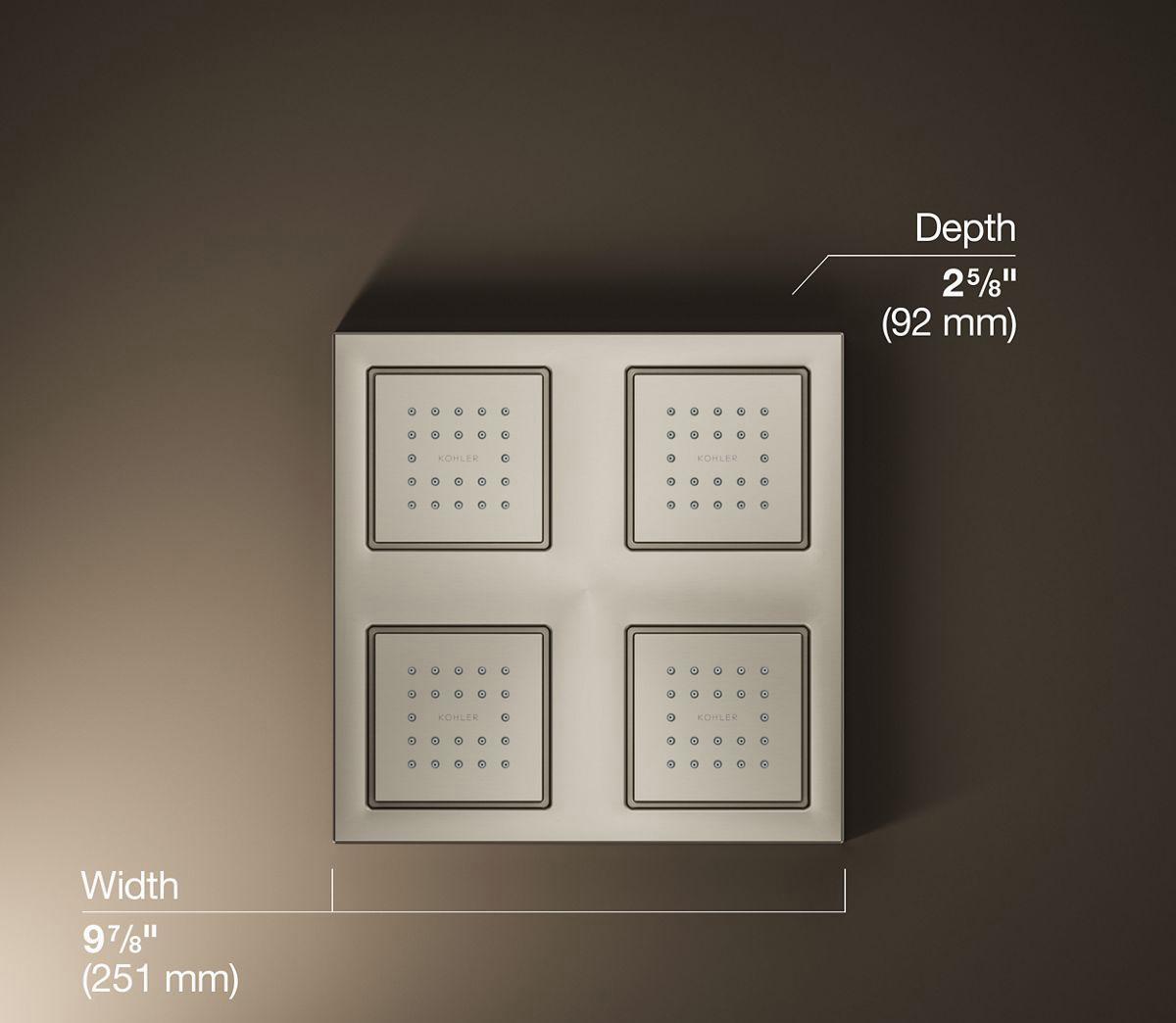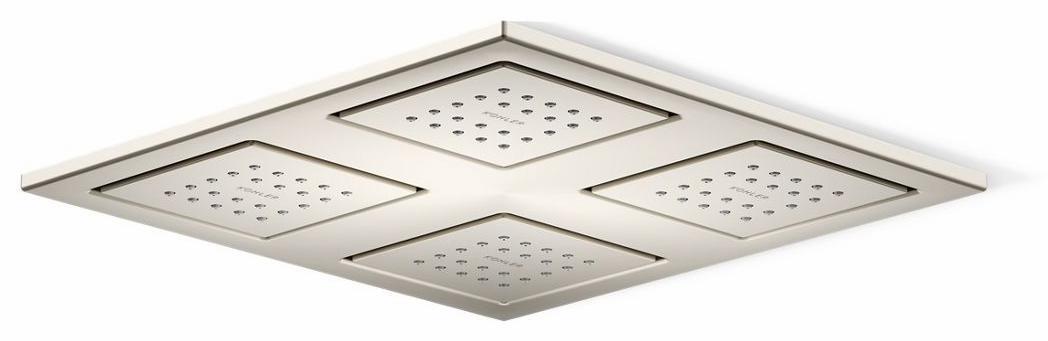 With four 22-nozzle sprayheads, WaterTile Square Rain overhead showering panels provide luxurious water delivery that even Mother Nature would envy. Four fully adjustable and pivoting square sprayheads distribute a relaxing shower of water that simulates a gentle summer rain.