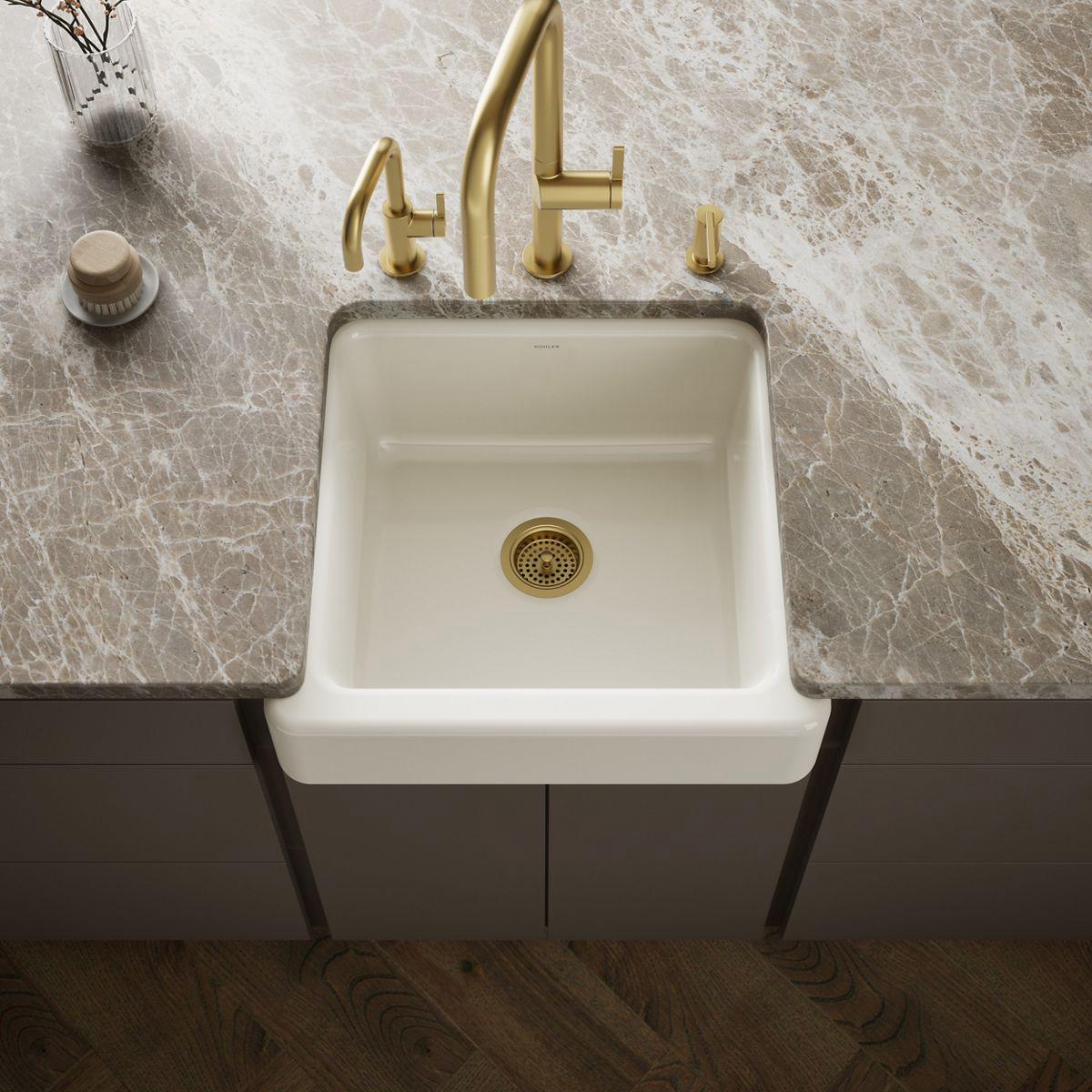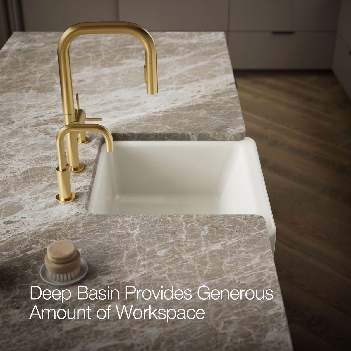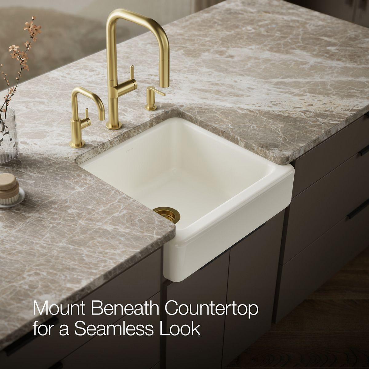 - Shortened apron allows sink to be used in most standard cabinetry or retrofitted to existing standard cabinetry.