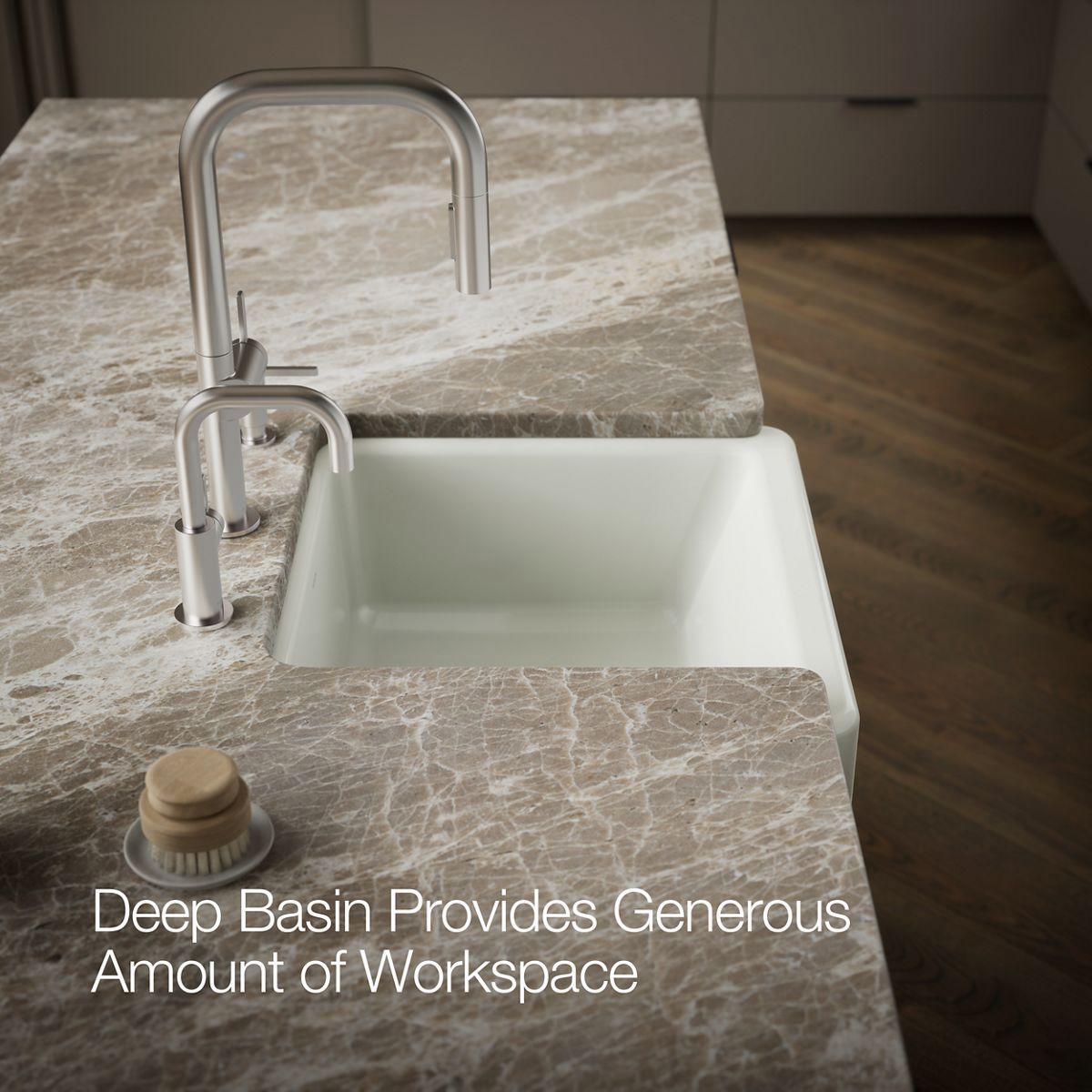 - Shortened apron allows sink to be used in most standard cabinetry or retrofitted to existing standard cabinetry.