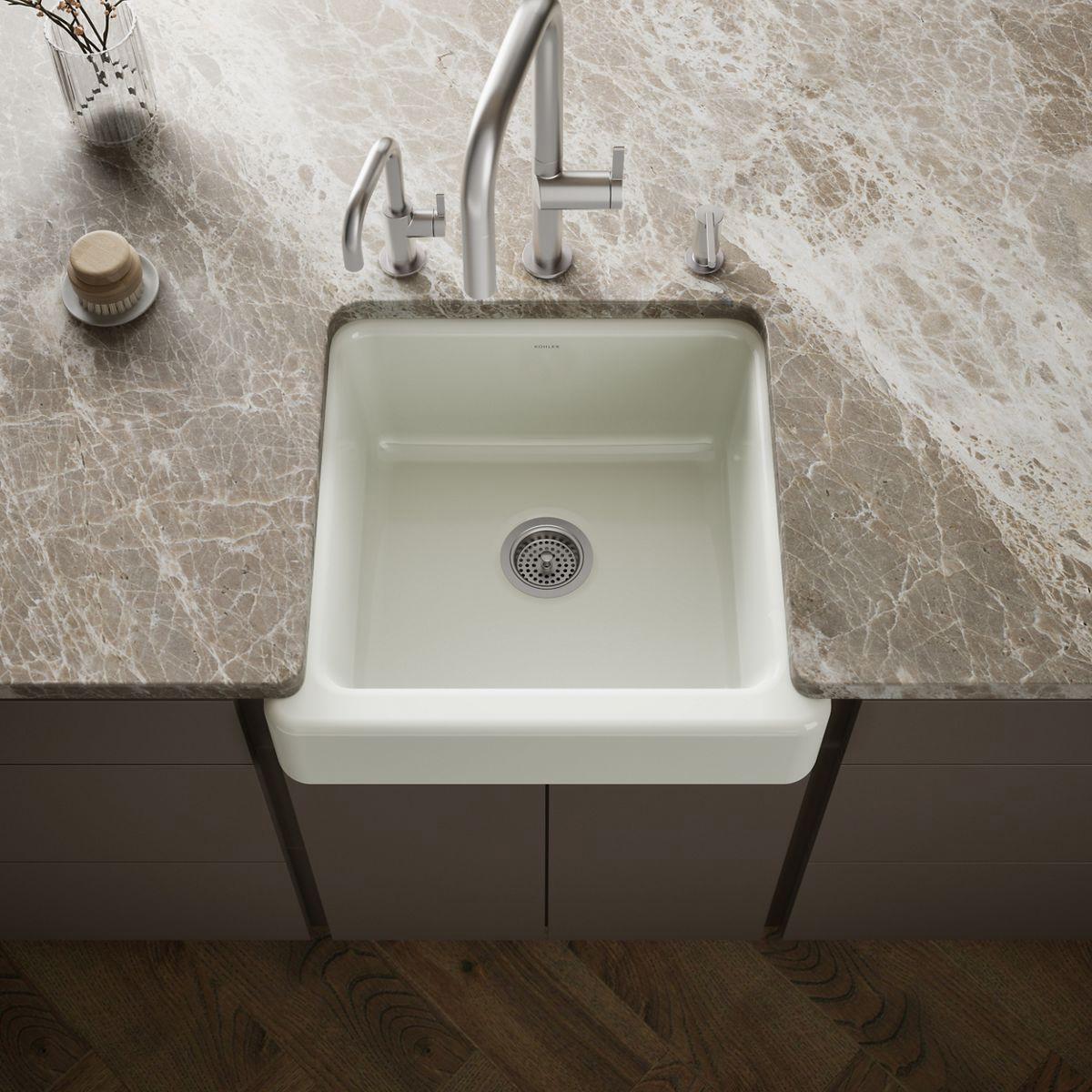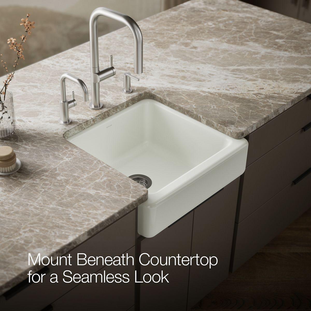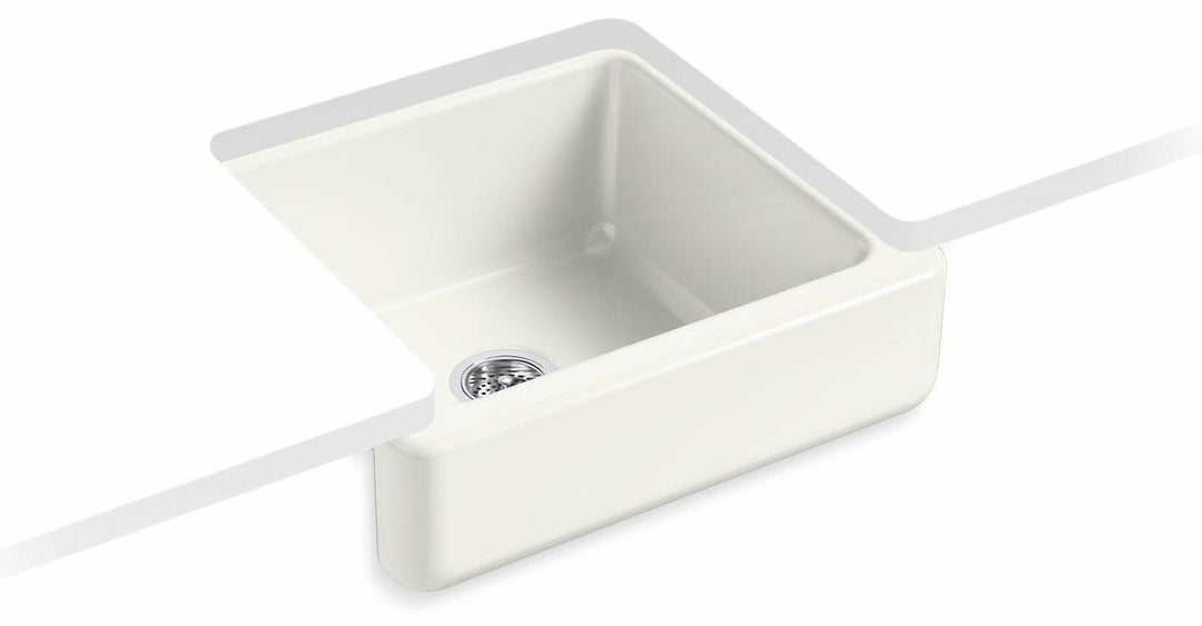 The Whitehaven apron-front kitchen sink features a streamlined and versatile farmhouse style to complement any decor. Perfect for remodeling projects, it has a shortened apron that allows for installation on most new or existing 24-inch standard cabinetry. The Self-Trimming design requires only a simple rough cut, overlapping the cabinet face for beautiful results and easy installation. A large single basin accommodates pots and pans, while the sloped bottom helps with draining and cleanup. Crafted from enameled cast iron, this sink resists chipping, cracking, or burning for years of beauty and reliable performance.