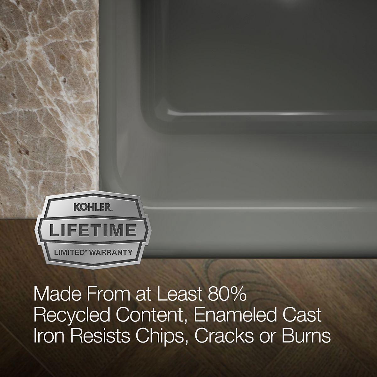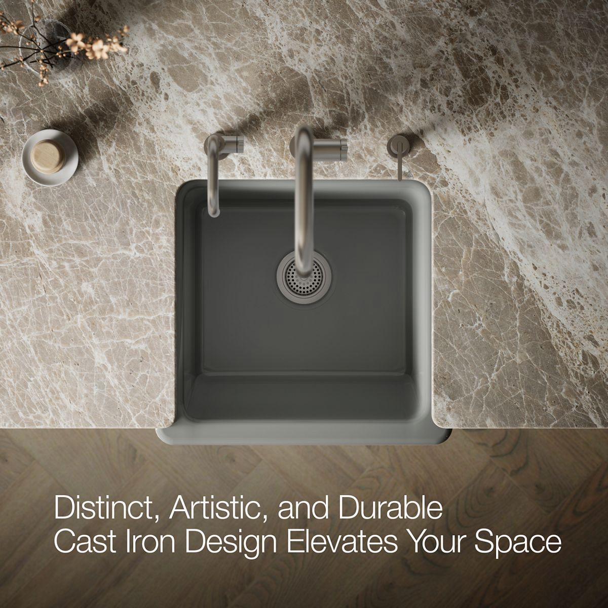 The Whitehaven apron-front kitchen sink features a streamlined and versatile farmhouse style to complement any decor. Perfect for remodeling projects, it has a shortened apron that allows for installation on most new or existing 24-inch standard cabinetry. The Self-Trimming design requires only a simple rough cut, overlapping the cabinet face for beautiful results and easy installation. A large single basin accommodates pots and pans, while the sloped bottom helps with draining and cleanup. Crafted from enameled cast iron, this sink resists chipping, cracking, or burning for years of beauty and reliable performance.