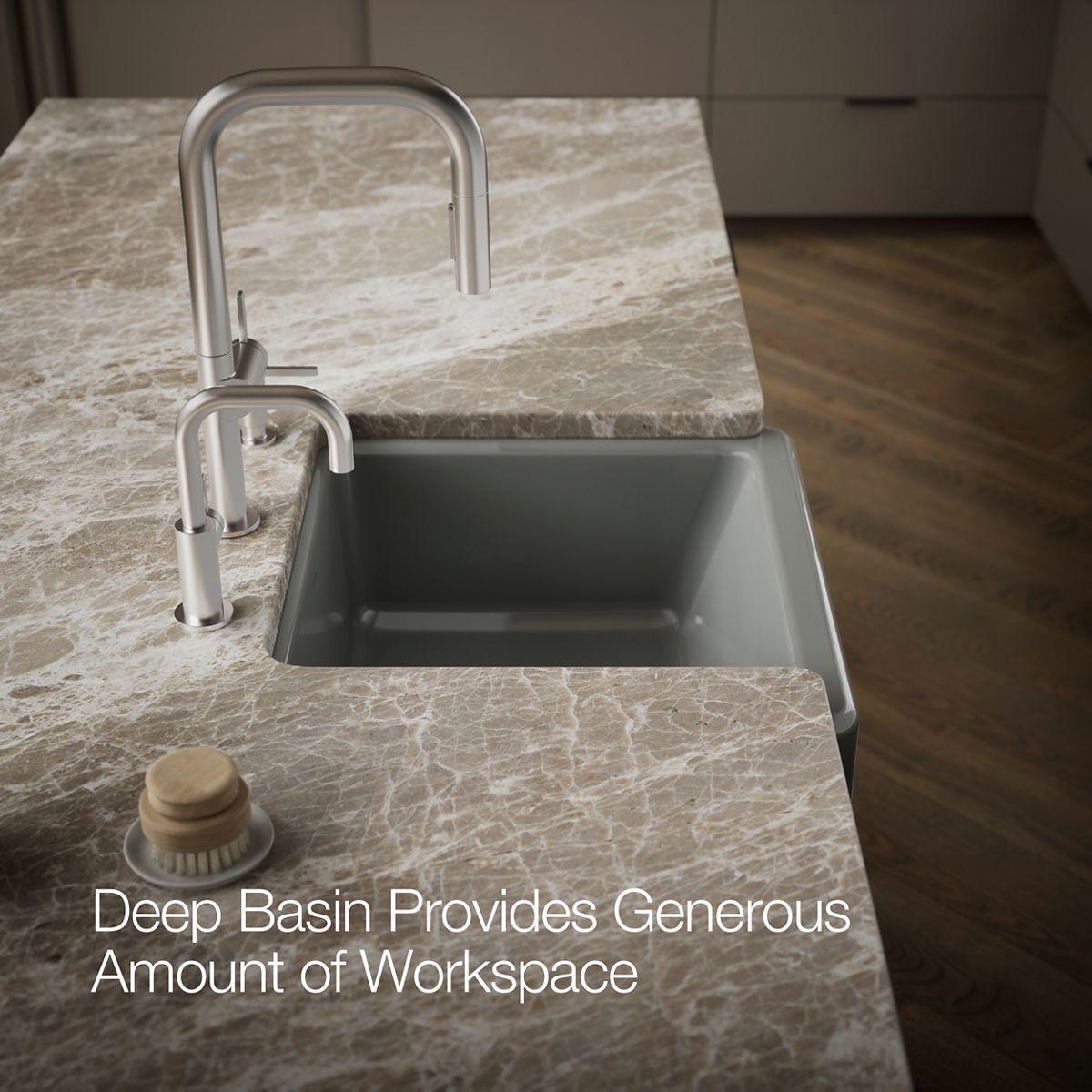 - Shortened apron allows sink to be used in most standard cabinetry or retrofitted to existing standard cabinetry.