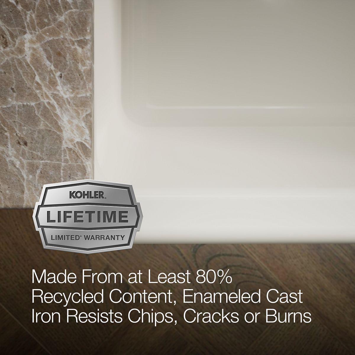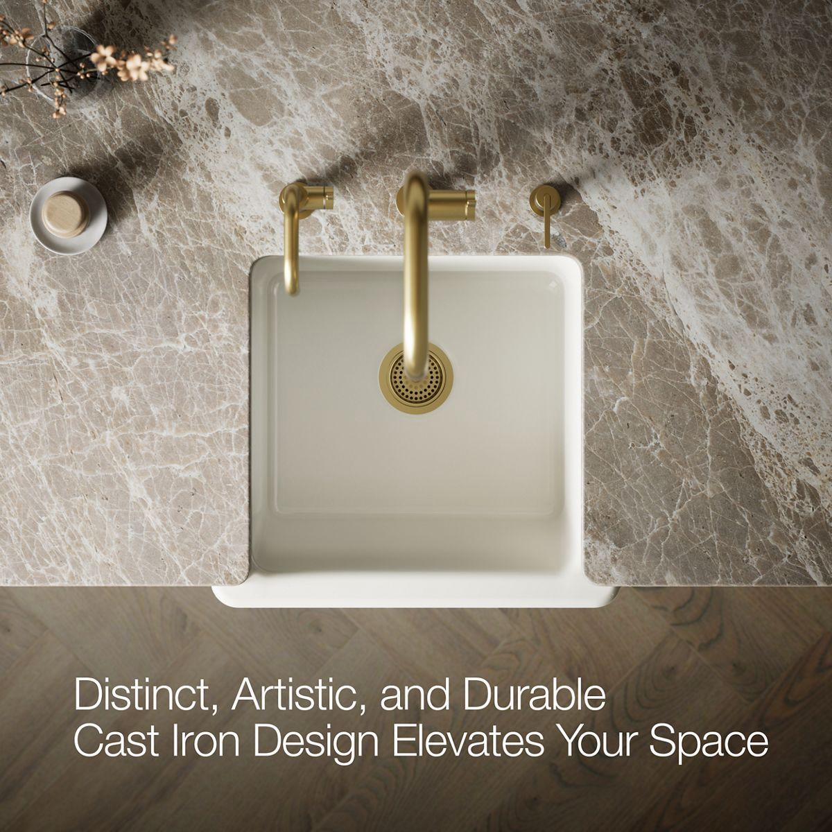The Whitehaven apron-front kitchen sink features a streamlined and versatile farmhouse style to complement any decor. A large single basin accommodates pots and pans, while the sloped bottom helps with draining and cleanup. Crafted from enameled cast iron, this sink resists chipping, cracking, or burning for years of beauty and reliable performance. A standard apron front makes it easy to install on 24-inch apron-front cabinetry. The Self-Trimming design requires only a simple rough cut, overlapping the cabinet face for beautiful results.