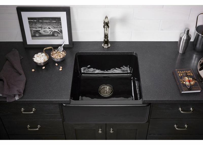 The Whitehaven apron-front kitchen sink features a streamlined and versatile farmhouse style to complement any decor. A large single basin accommodates pots and pans, while the sloped bottom helps with draining and cleanup. Crafted from enameled cast iron, this sink resists chipping, cracking, or burning for years of beauty and reliable performance. A standard apron front makes it easy to install on 24-inch apron-front cabinetry. The Self-Trimming design requires only a simple rough cut, overlapping the cabinet face for beautiful results.