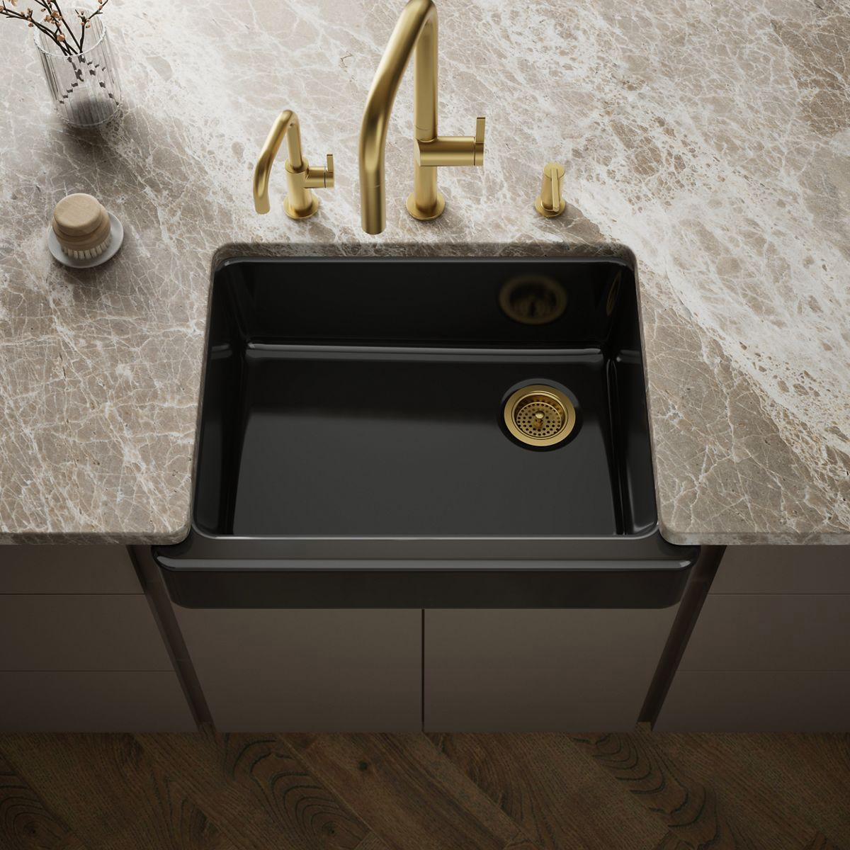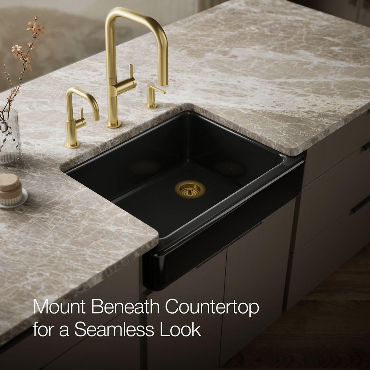 The Whitehaven apron-front kitchen sink features a streamlined and versatile farmhouse style. Perfect for remodeling projects, the Self-Trimming design requires only a rough cut to new or existing 30-inch standard cabinetry for simple installation and beautiful results. A large single basin accommodates large pots and pans, while the sloped bottom helps with draining and cleanup. Crafted from enameled cast iron, this sink resists chipping, cracking, or burning for years of beauty and reliable performance.