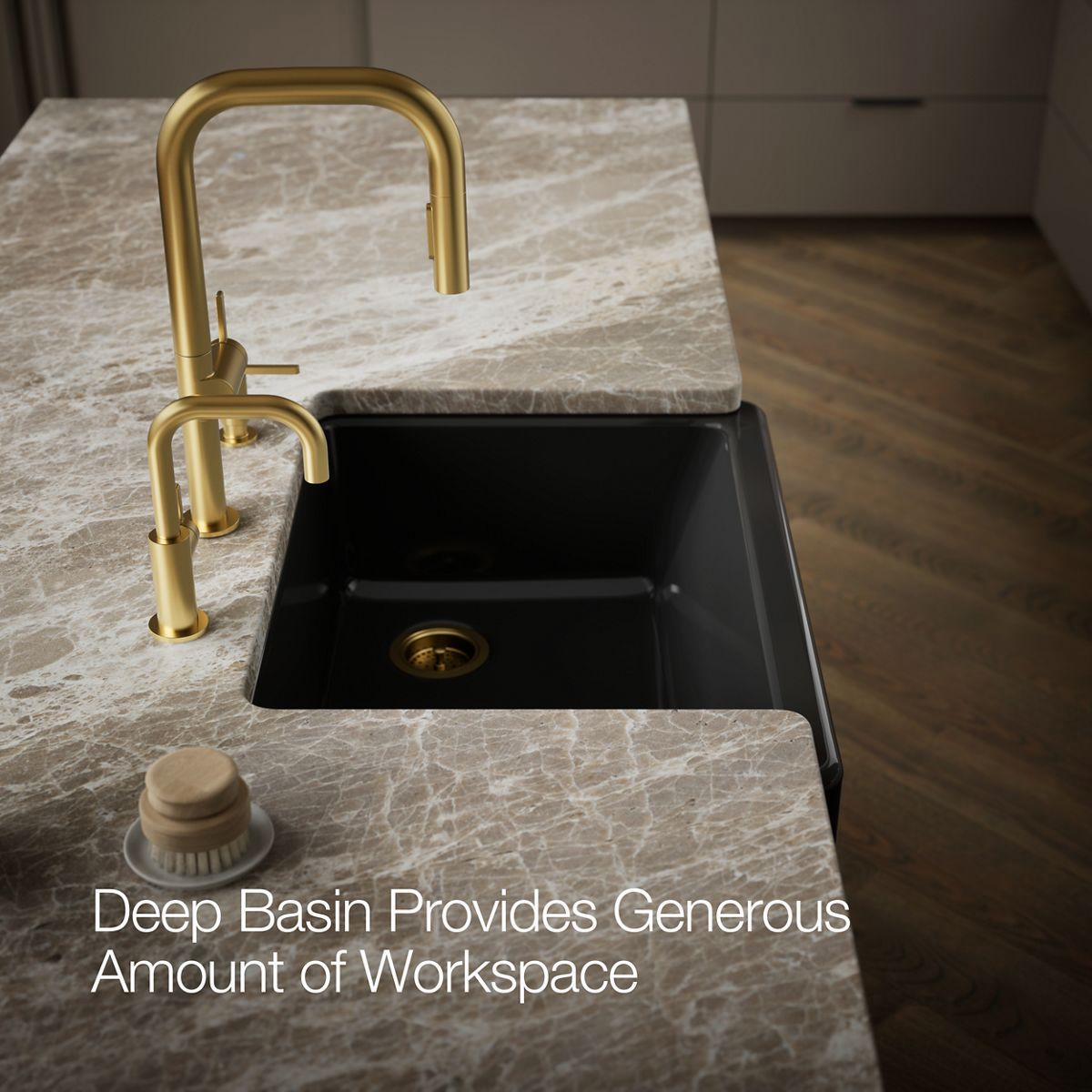 - Short 6-11/16" (170 mm) apron allows sink to be used in new or existing standard cabinetry.