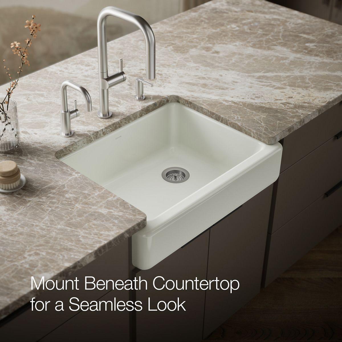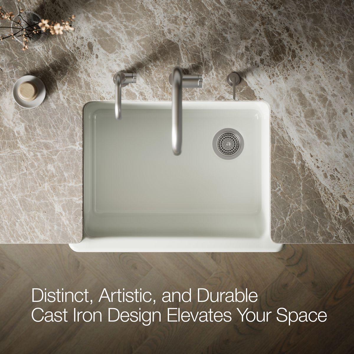 The Whitehaven apron-front kitchen sink features a streamlined and versatile farmhouse style. Perfect for remodeling projects, the Self-Trimming design requires only a rough cut to new or existing 30-inch standard cabinetry for simple installation and beautiful results. A large single basin accommodates large pots and pans, while the sloped bottom helps with draining and cleanup. Crafted from enameled cast iron, this sink resists chipping, cracking, or burning for years of beauty and reliable performance.