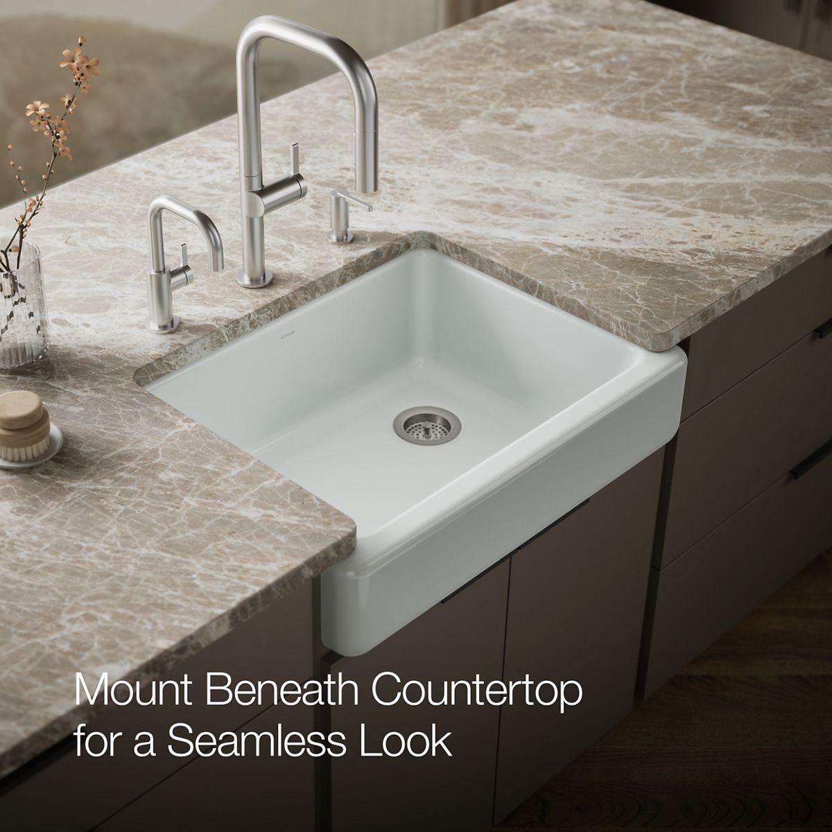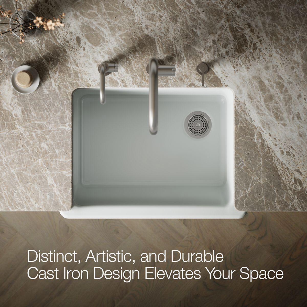 The Whitehaven apron-front kitchen sink features a streamlined and versatile farmhouse style. Perfect for remodeling projects, the Self-Trimming design requires only a rough cut to new or existing 30-inch standard cabinetry for simple installation and beautiful results. A large single basin accommodates large pots and pans, while the sloped bottom helps with draining and cleanup. Crafted from enameled cast iron, this sink resists chipping, cracking, or burning for years of beauty and reliable performance.