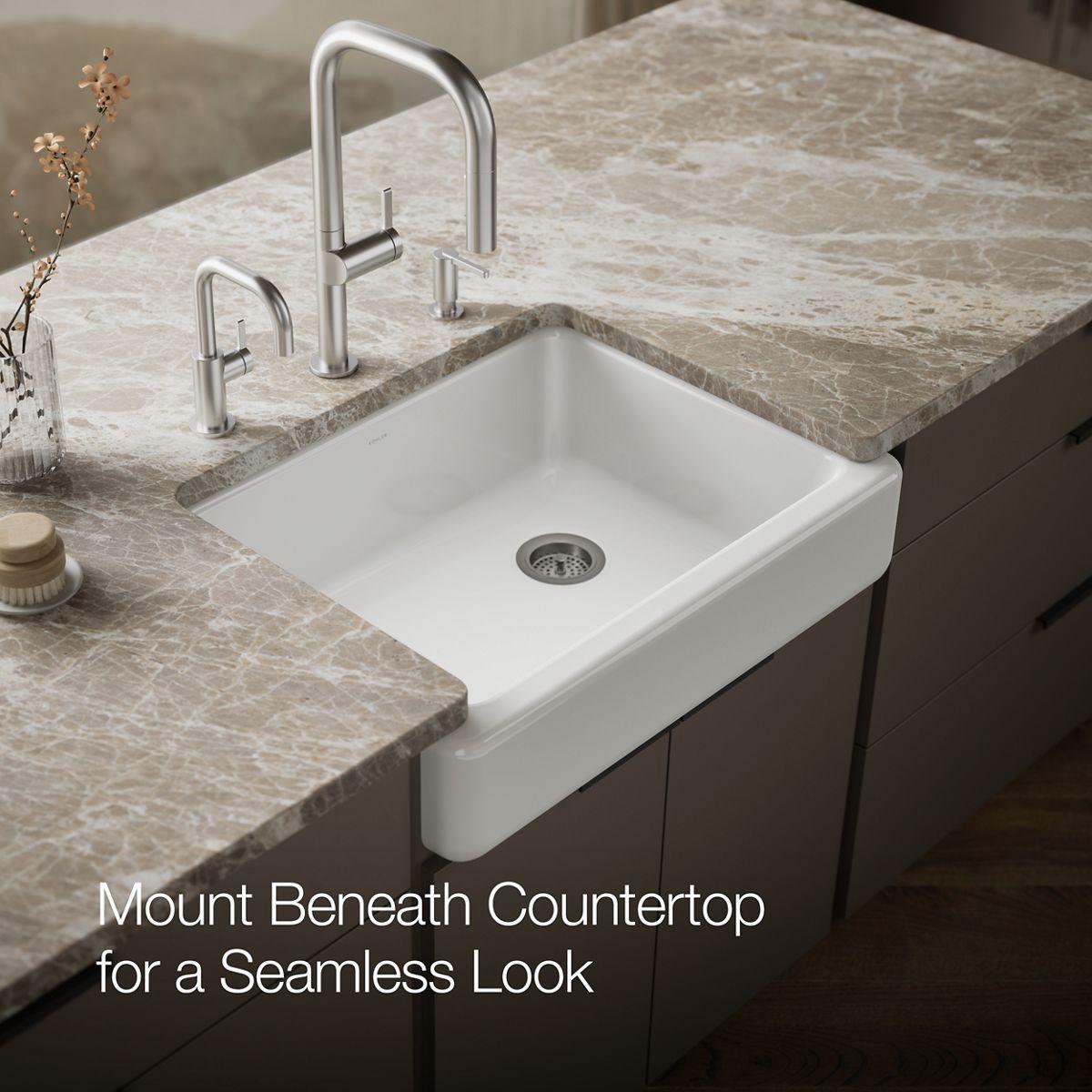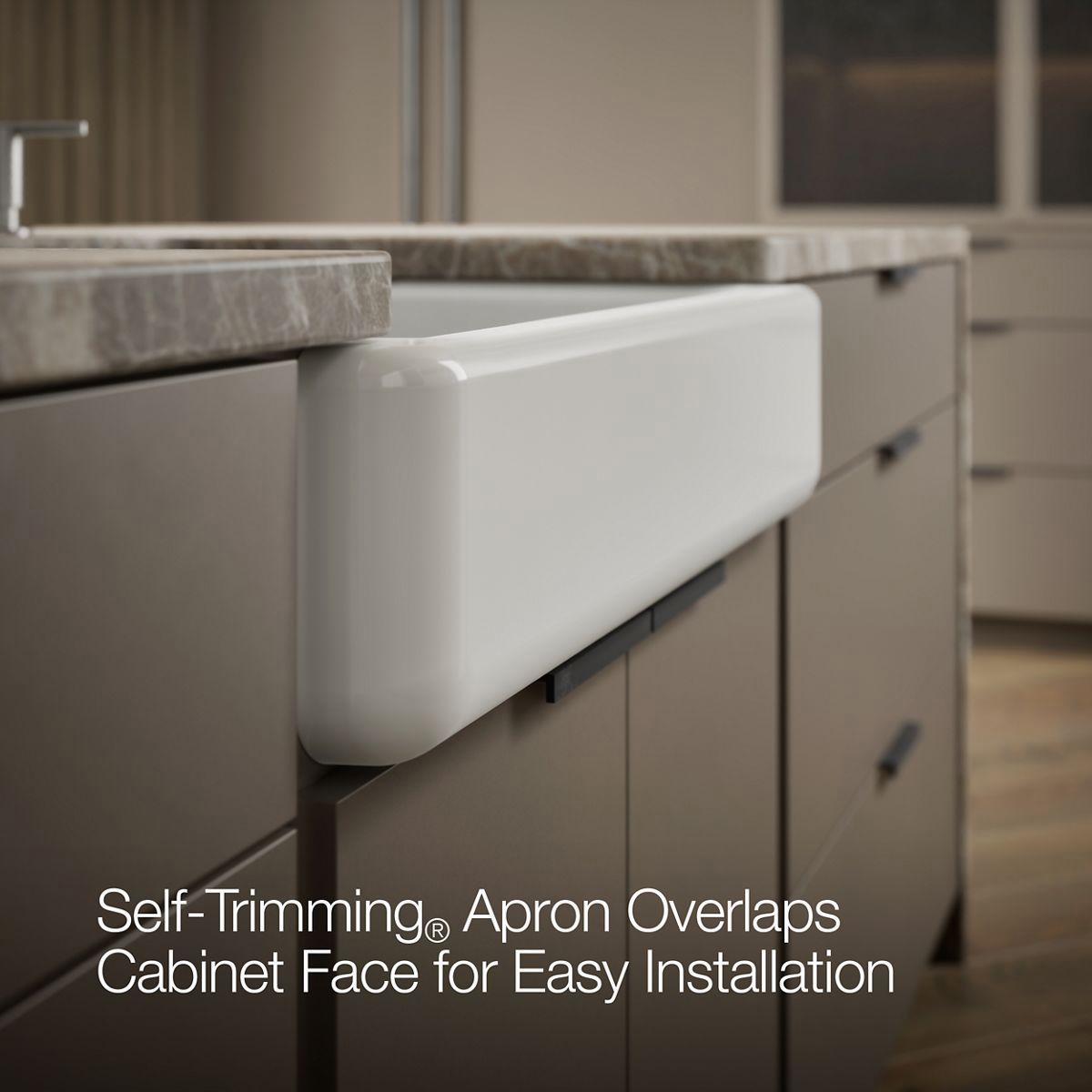 The Whitehaven apron-front kitchen sink features a streamlined and versatile farmhouse style. Perfect for remodeling projects, the Self-Trimming design requires only a rough cut to new or existing 30-inch standard cabinetry for simple installation and beautiful results. A large single basin accommodates large pots and pans, while the sloped bottom helps with draining and cleanup. Crafted from enameled cast iron, this sink resists chipping, cracking, or burning for years of beauty and reliable performance.