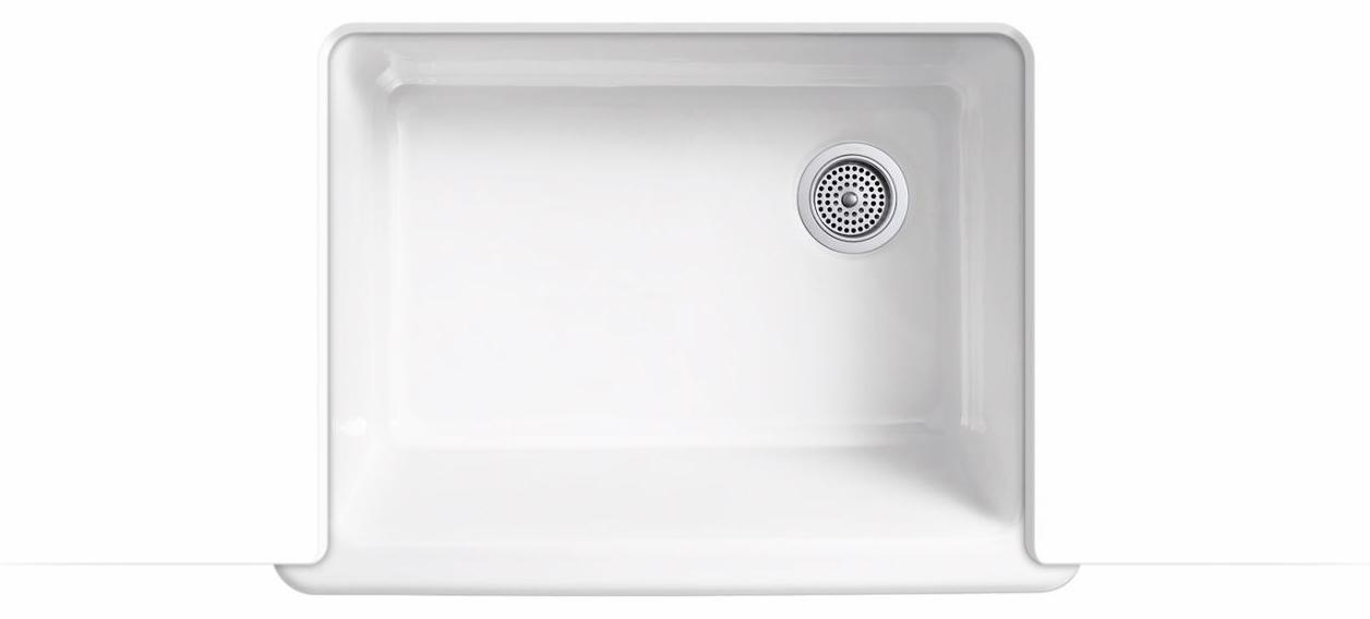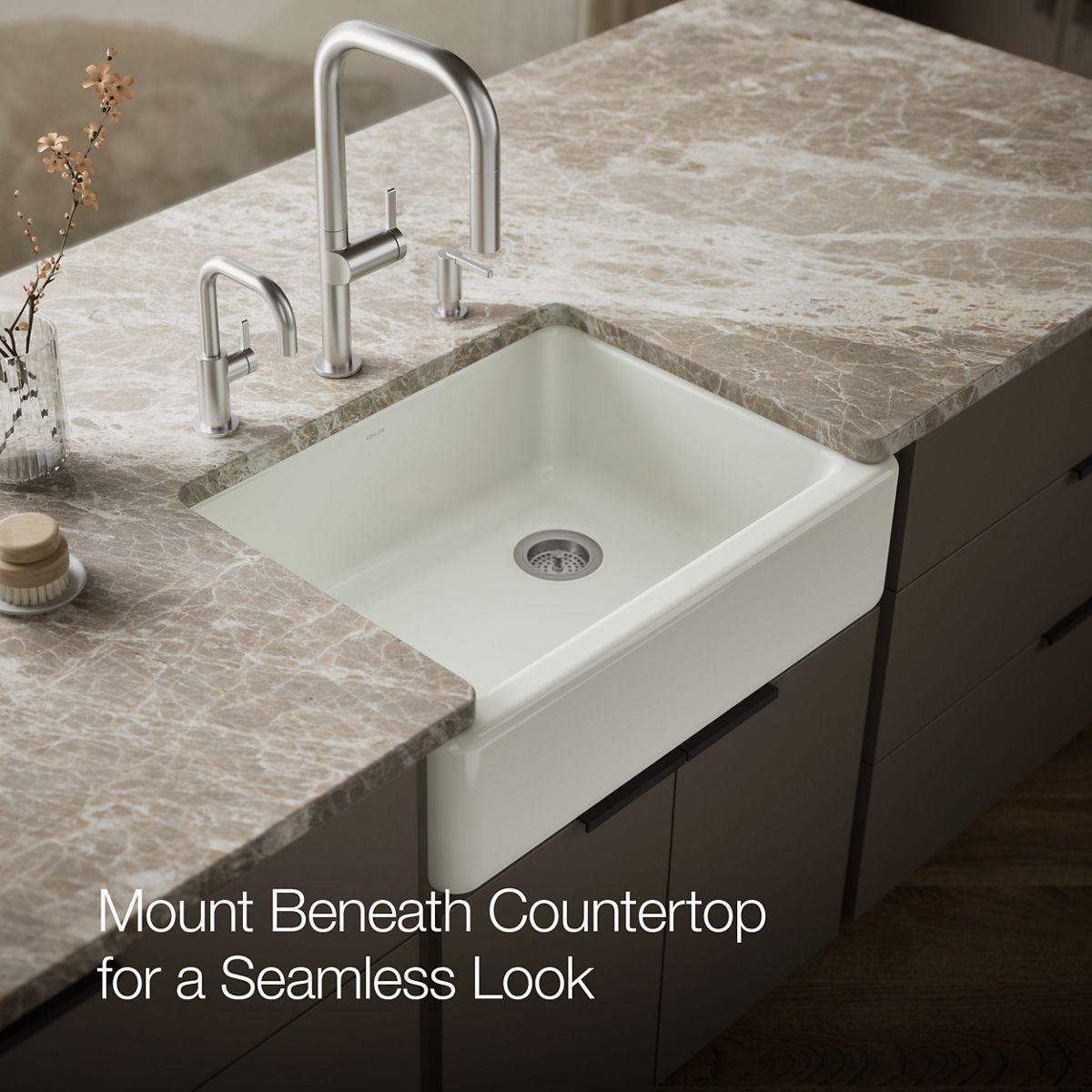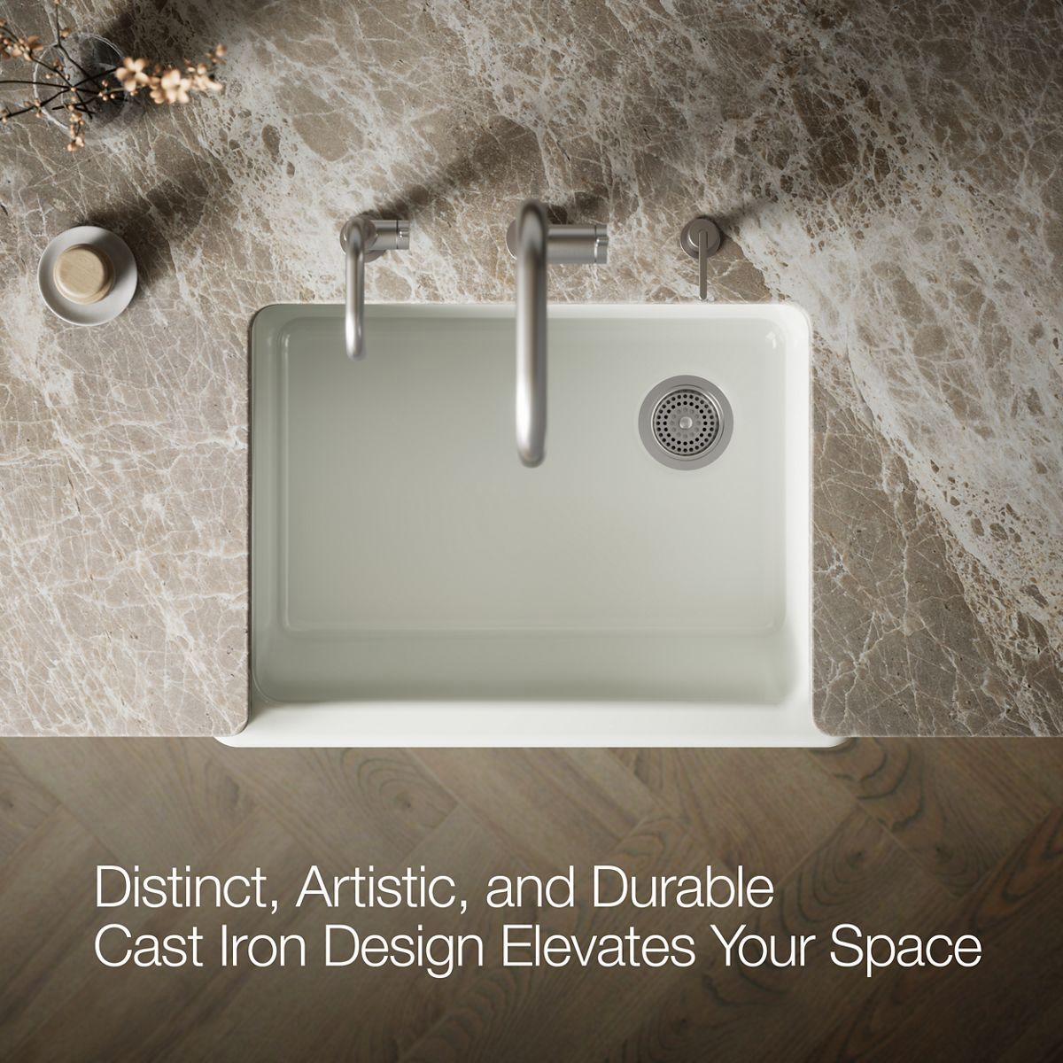 The Whitehaven apron-front kitchen sink features a streamlined and versatile farmhouse style. The Self-Trimming design requires only a simple rough cut, overlapping the cabinet face for beautiful results. The tall integral apron also acts as a drip edge to protect the cabinet from water damage. A large single basin accommodates large pots and pans, while the sloped bottom helps with draining and cleanup. Crafted from enameled cast iron, this sink resists chipping, cracking, or burning for years of beauty and reliable performance.