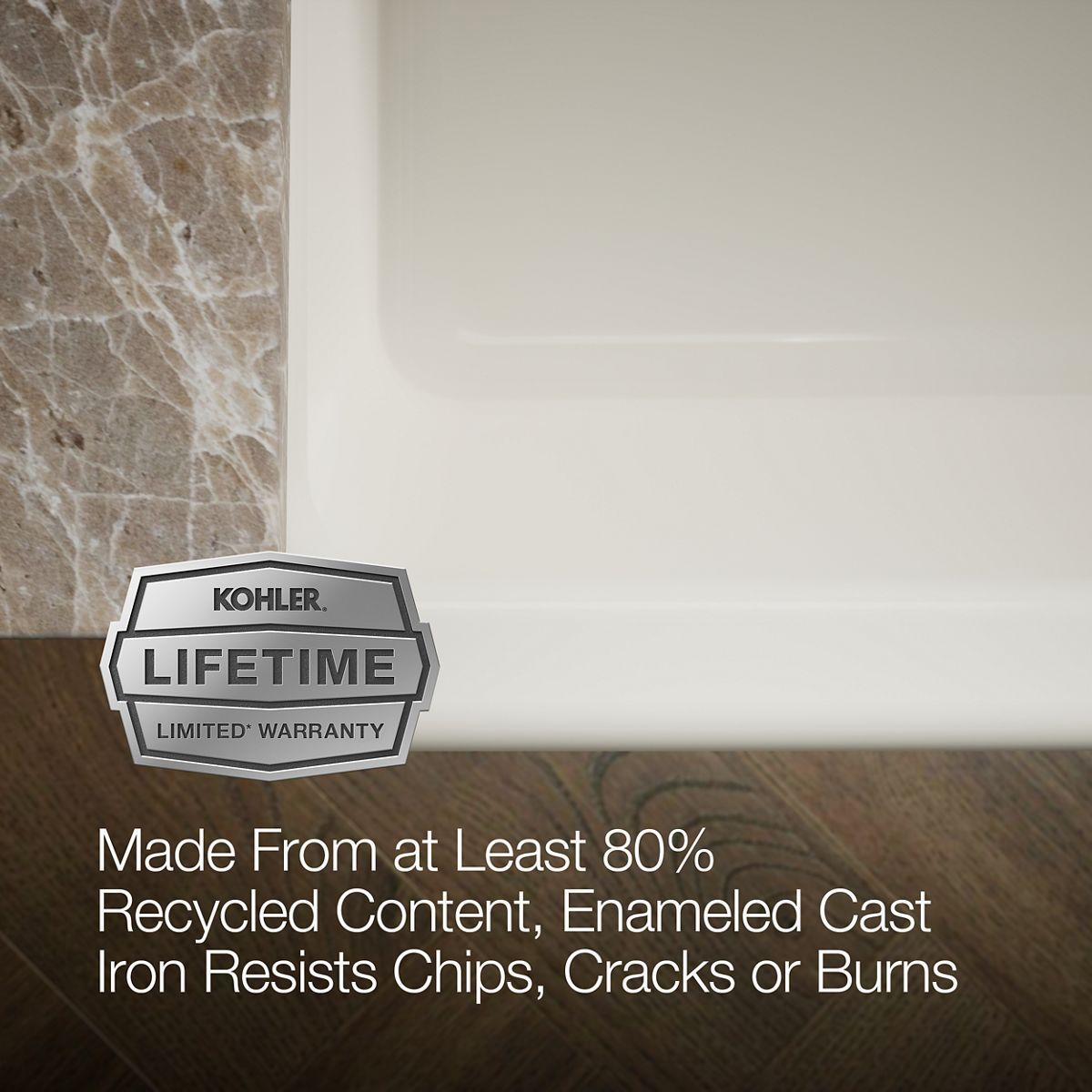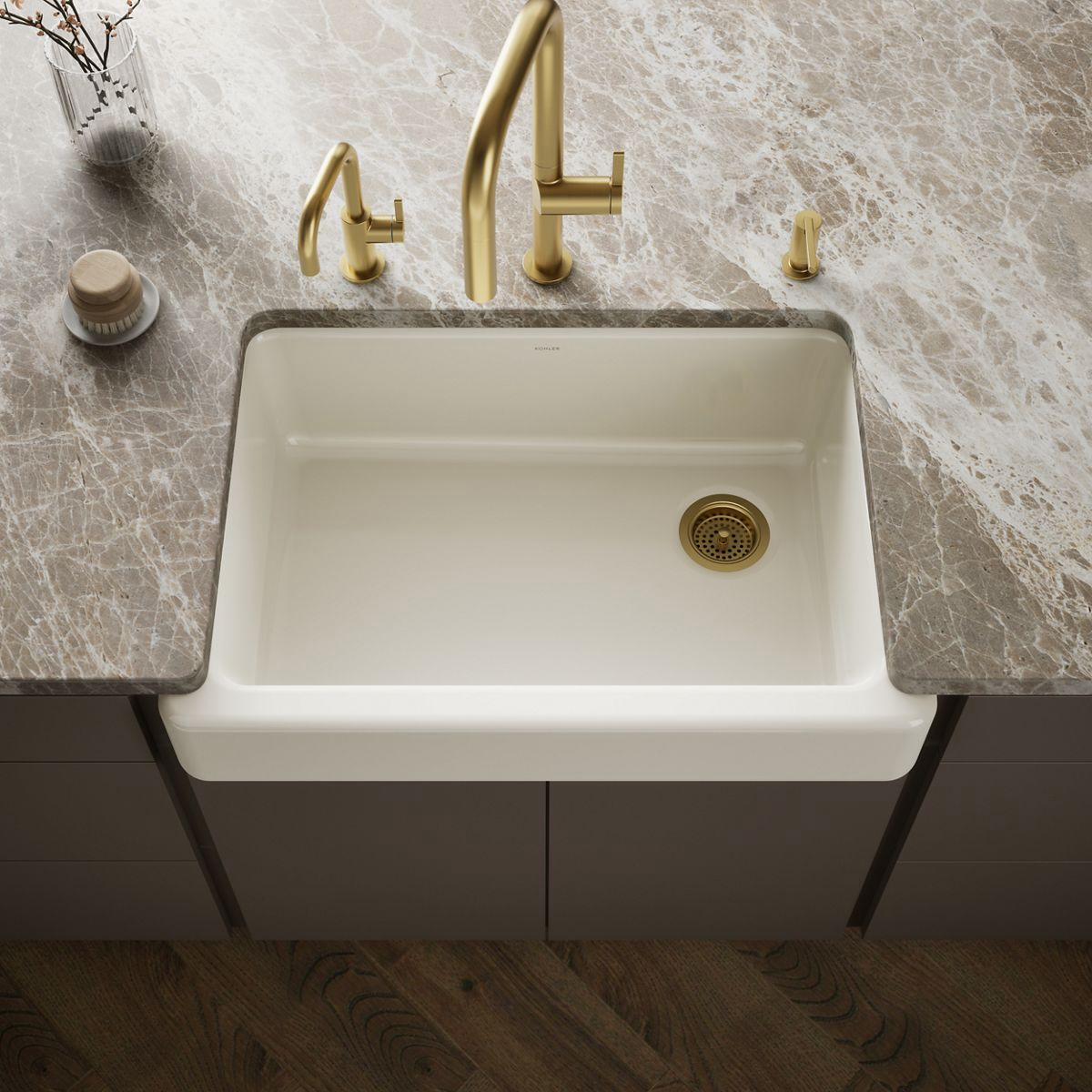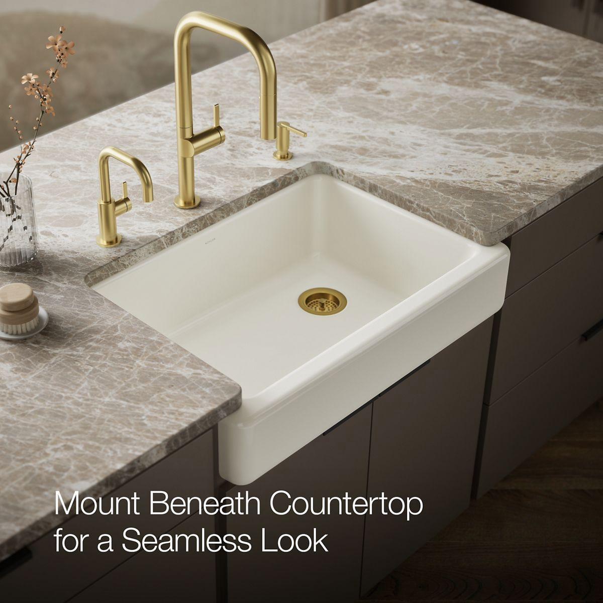 The Whitehaven apron-front kitchen sink features a streamlined and versatile farmhouse style to complement any decor. Perfect for remodeling projects, it has a shortened apron that allows for installation on most new or existing 33-inch standard cabinetry. The Self-Trimming design requires only a simple rough cut, overlapping the cabinet face for beautiful results and easy installation. A large single basin accommodates large pots and pans, while the sloped bottom helps with draining and cleanup. Crafted from enameled cast iron, this sink resists chipping, cracking, or burning for years of beauty and reliable performance.