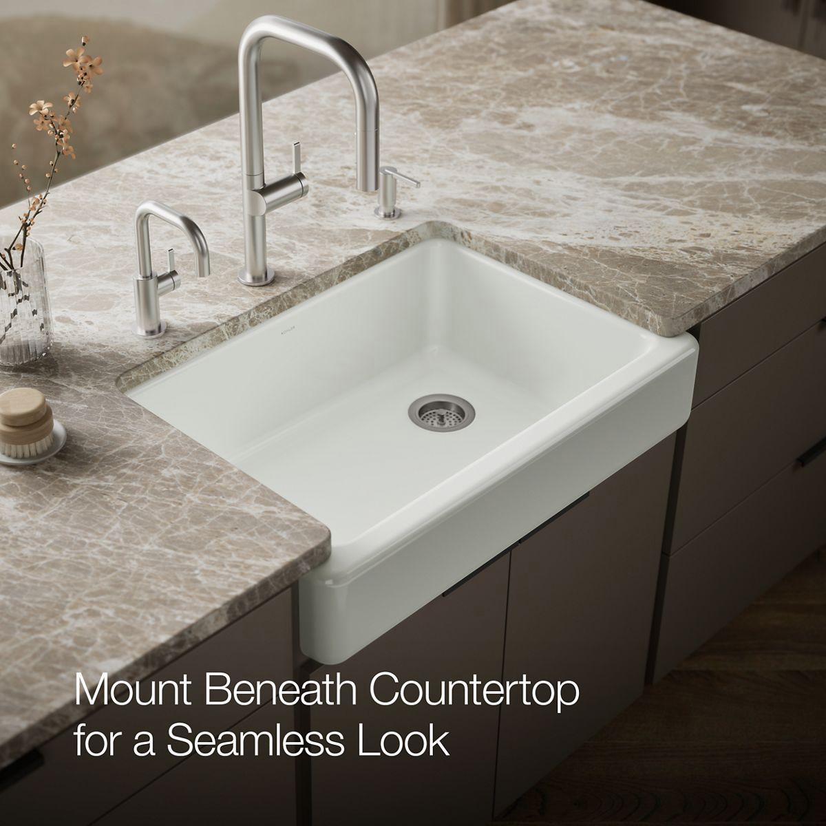 The Whitehaven apron-front kitchen sink features a streamlined and versatile farmhouse style to complement any decor. Perfect for remodeling projects, it has a shortened apron that allows for installation on most new or existing 33-inch standard cabinetry. The Self-Trimming design requires only a simple rough cut, overlapping the cabinet face for beautiful results and easy installation. A large single basin accommodates large pots and pans, while the sloped bottom helps with draining and cleanup. Crafted from enameled cast iron, this sink resists chipping, cracking, or burning for years of beauty and reliable performance.