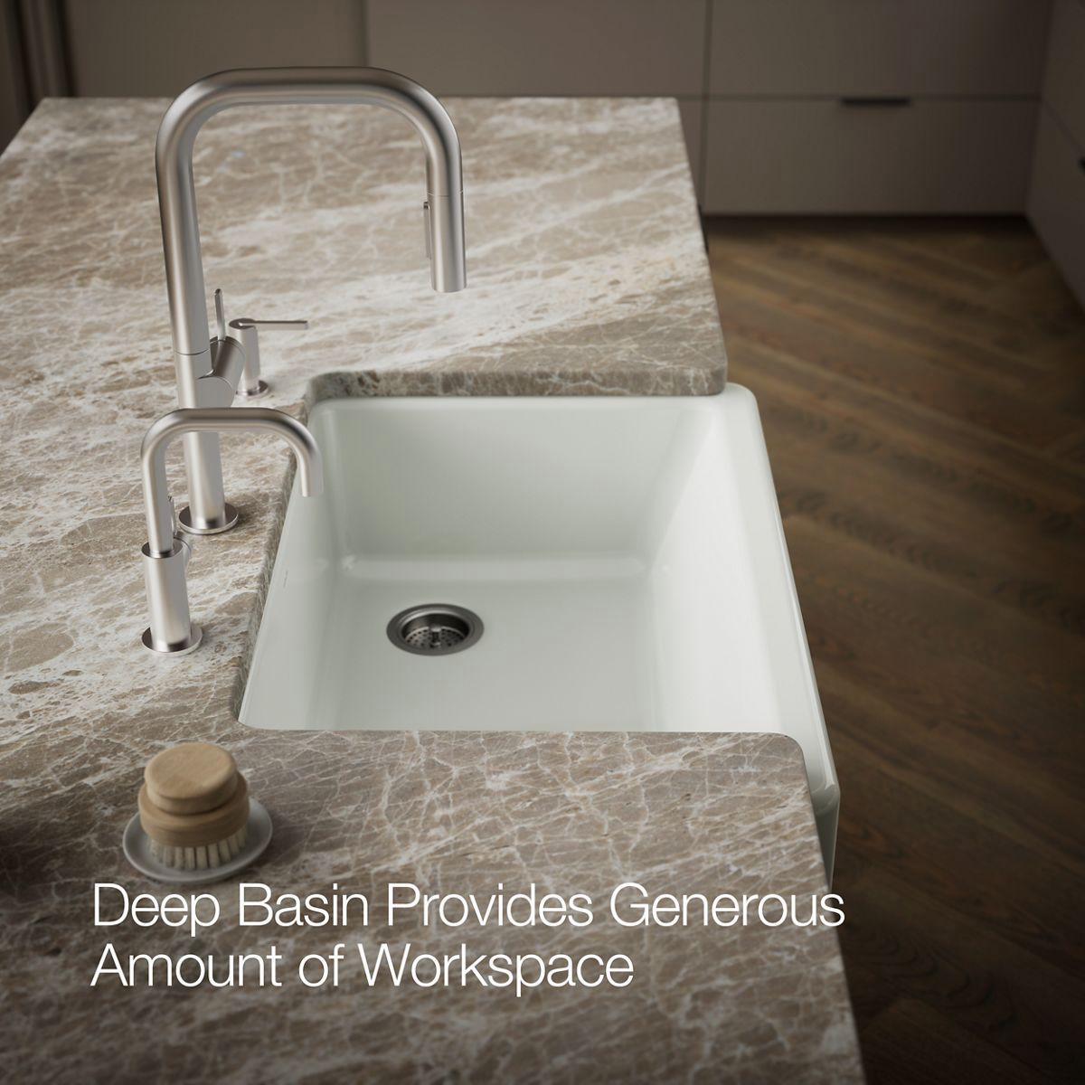 - Shortened apron allows sink to be used in most standard cabinetry or retrofitted to existing standard cabinetry.