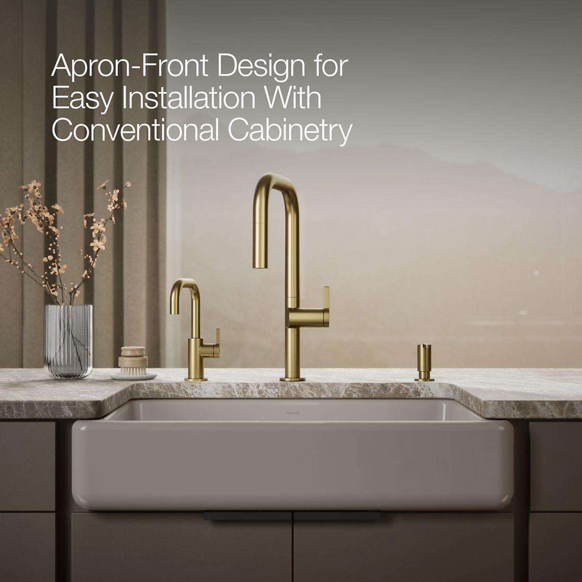 - Shortened apron allows sink to be used in most standard cabinetry or retrofitted to existing standard cabinetry