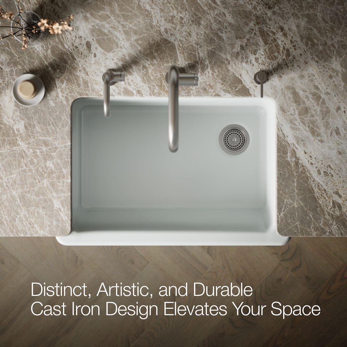 The Whitehaven apron-front kitchen sink features a streamlined and versatile farmhouse style to complement any decor. A large single basin accommodates large pots and pans, while the sloped bottom helps with draining and cleanup. Crafted from enameled cast iron, this sink resists chipping, cracking, or burning for years of beauty and reliable performance. A standard apron front makes it easy to install on 33-inch apron-front cabinetry. The Self-Trimming design requires only a simple rough cut, overlapping the cabinet face for beautiful results.