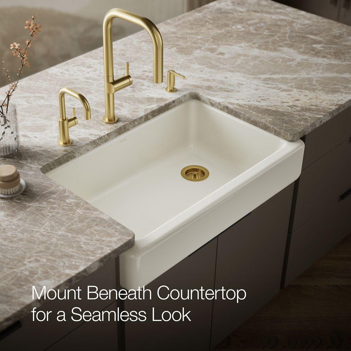 The Whitehaven apron-front kitchen sink features a streamlined and versatile farmhouse style to complement any decor. Perfect for remodeling projects, it has a shortened apron that allows for installation on most new or existing 36-inch standard cabinetry. The Self-Trimming design requires only a simple rough cut, overlapping the cabinet face for beautiful results and easy installation. A large single basin accommodates large pots and pans, while the sloped bottom helps with draining and cleanup. Crafted from enameled cast iron, this sink resists chipping, cracking, or burning for years of beauty and reliable performance.