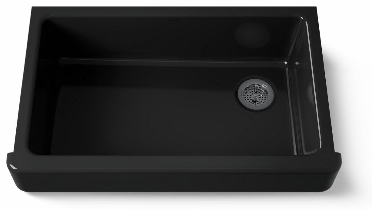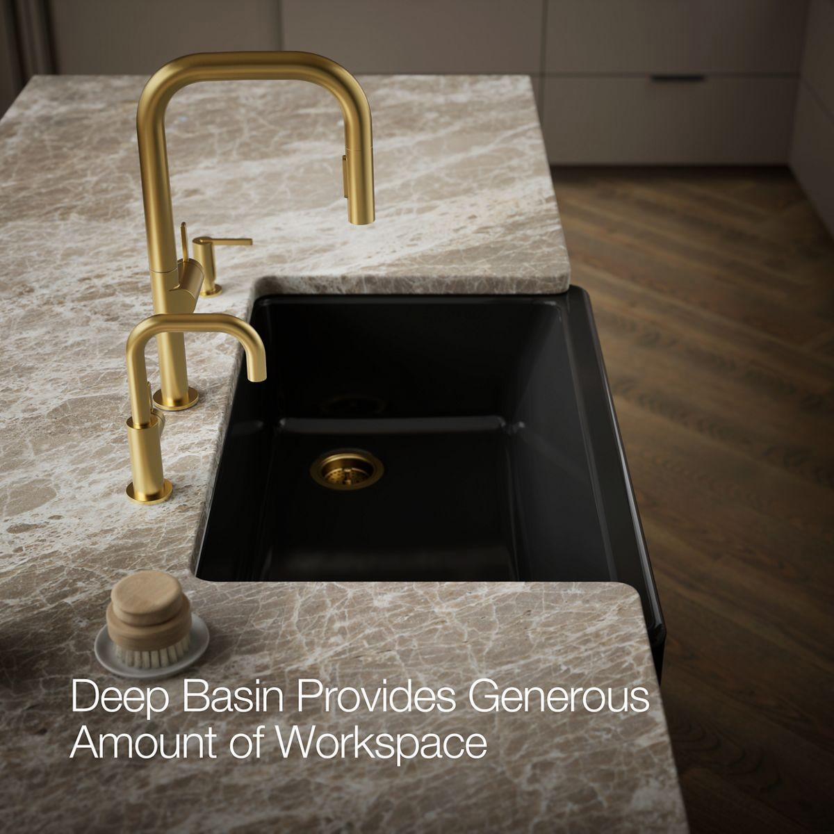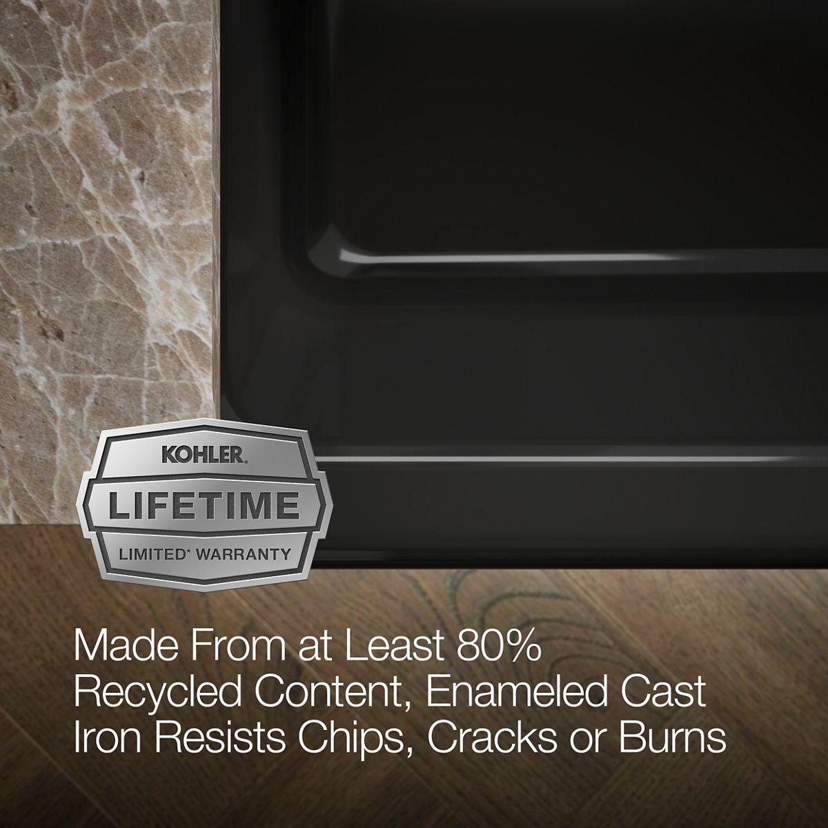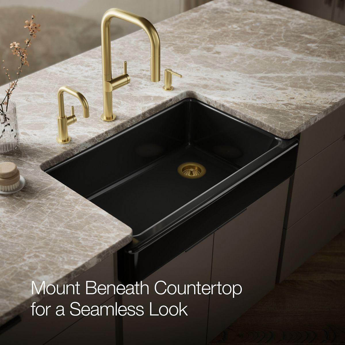 The Whitehaven apron-front kitchen sink features a streamlined and versatile farmhouse style to complement any decor. Perfect for remodeling projects, it has a shortened apron that allows for installation on most new or existing 36-inch standard cabinetry. The Self-Trimming design requires only a simple rough cut, overlapping the cabinet face for beautiful results and easy installation. A large single basin accommodates large pots and pans, while the sloped bottom helps with draining and cleanup. Crafted from enameled cast iron, this sink resists chipping, cracking, or burning for years of beauty and reliable performance.