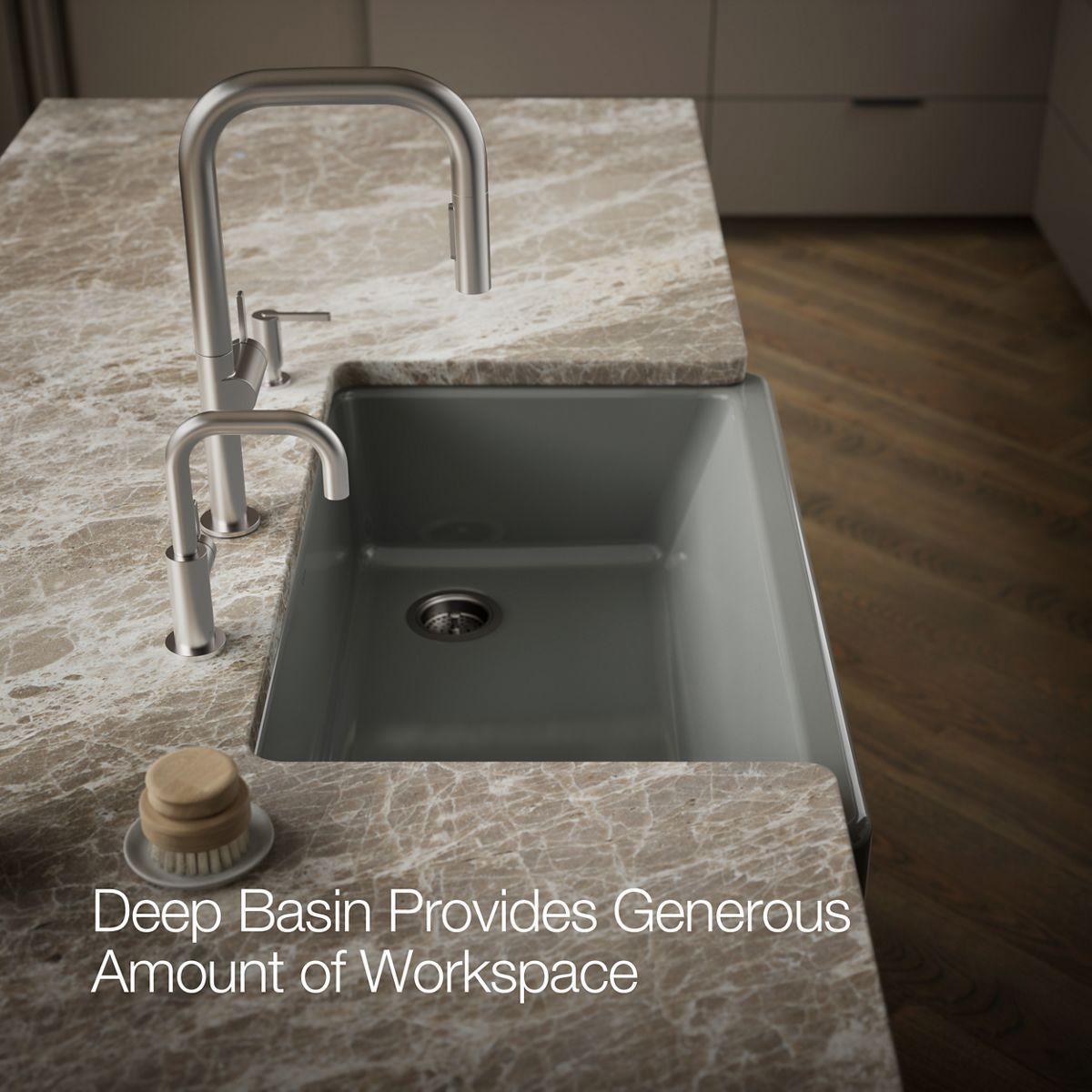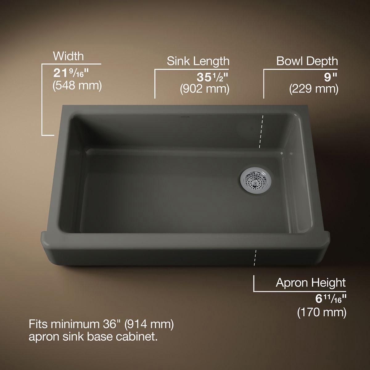 - Shortened apron allows sink to be used in most standard cabinetry or retrofitted to existing standard cabinetry.