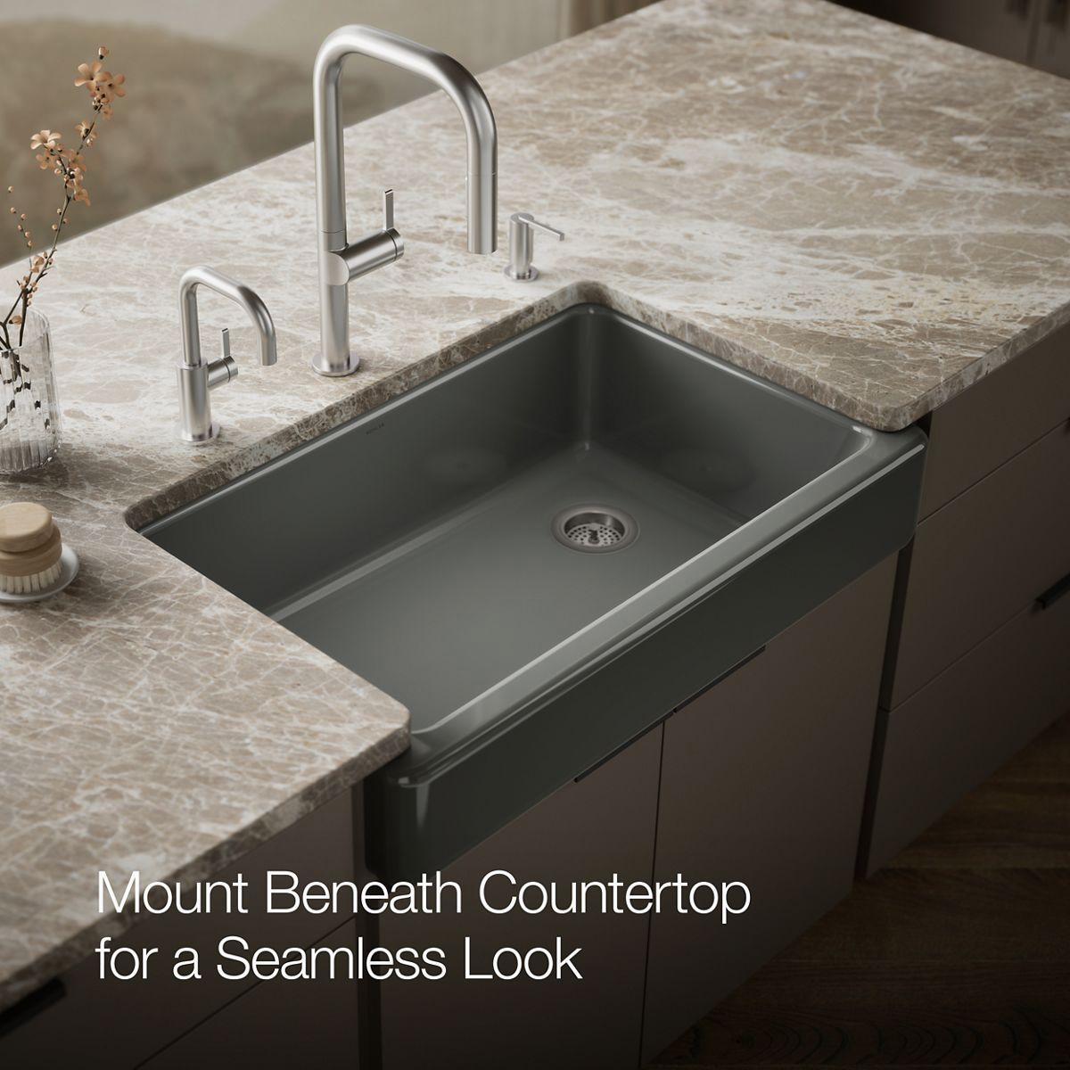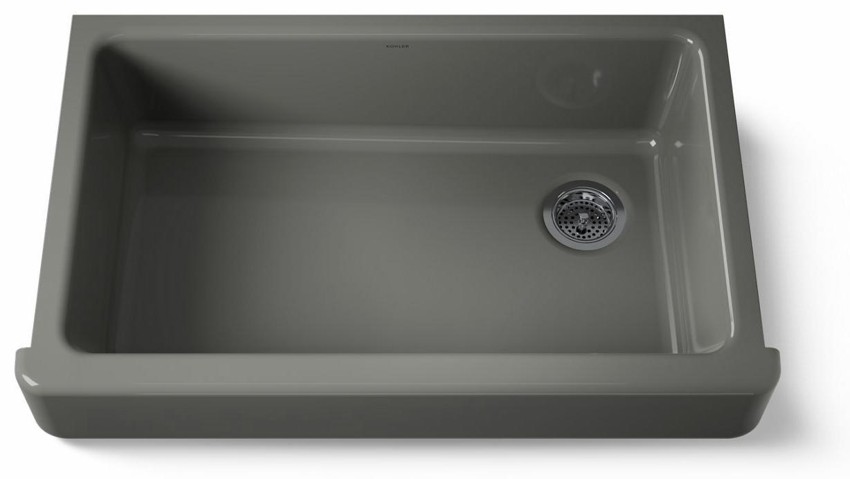 The Whitehaven apron-front kitchen sink features a streamlined and versatile farmhouse style to complement any decor. Perfect for remodeling projects, it has a shortened apron that allows for installation on most new or existing 36-inch standard cabinetry. The Self-Trimming design requires only a simple rough cut, overlapping the cabinet face for beautiful results and easy installation. A large single basin accommodates large pots and pans, while the sloped bottom helps with draining and cleanup. Crafted from enameled cast iron, this sink resists chipping, cracking, or burning for years of beauty and reliable performance.