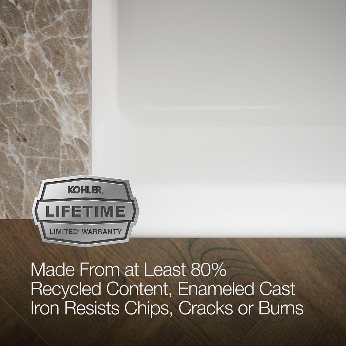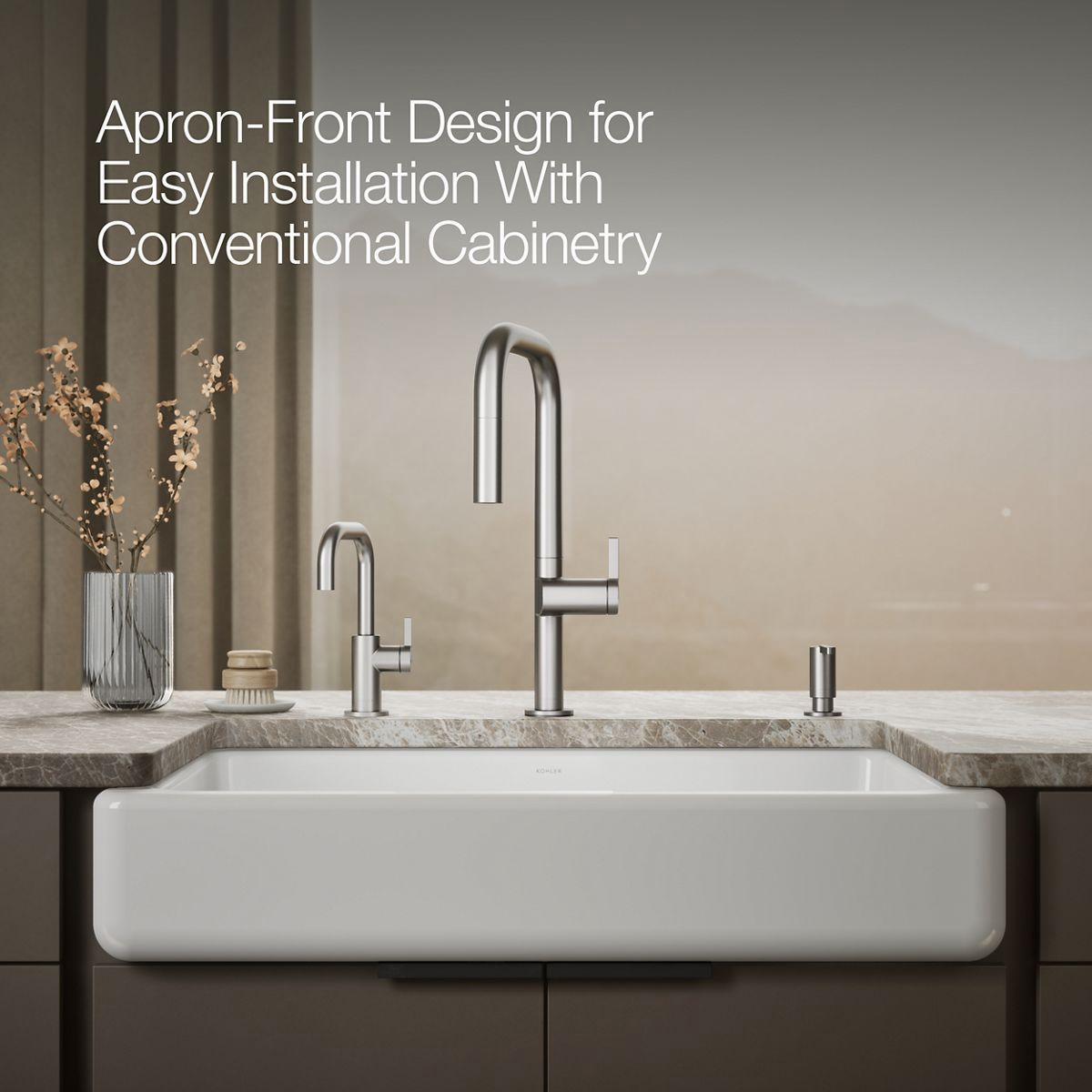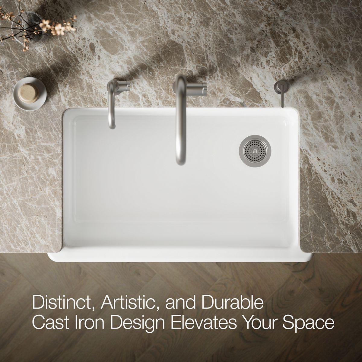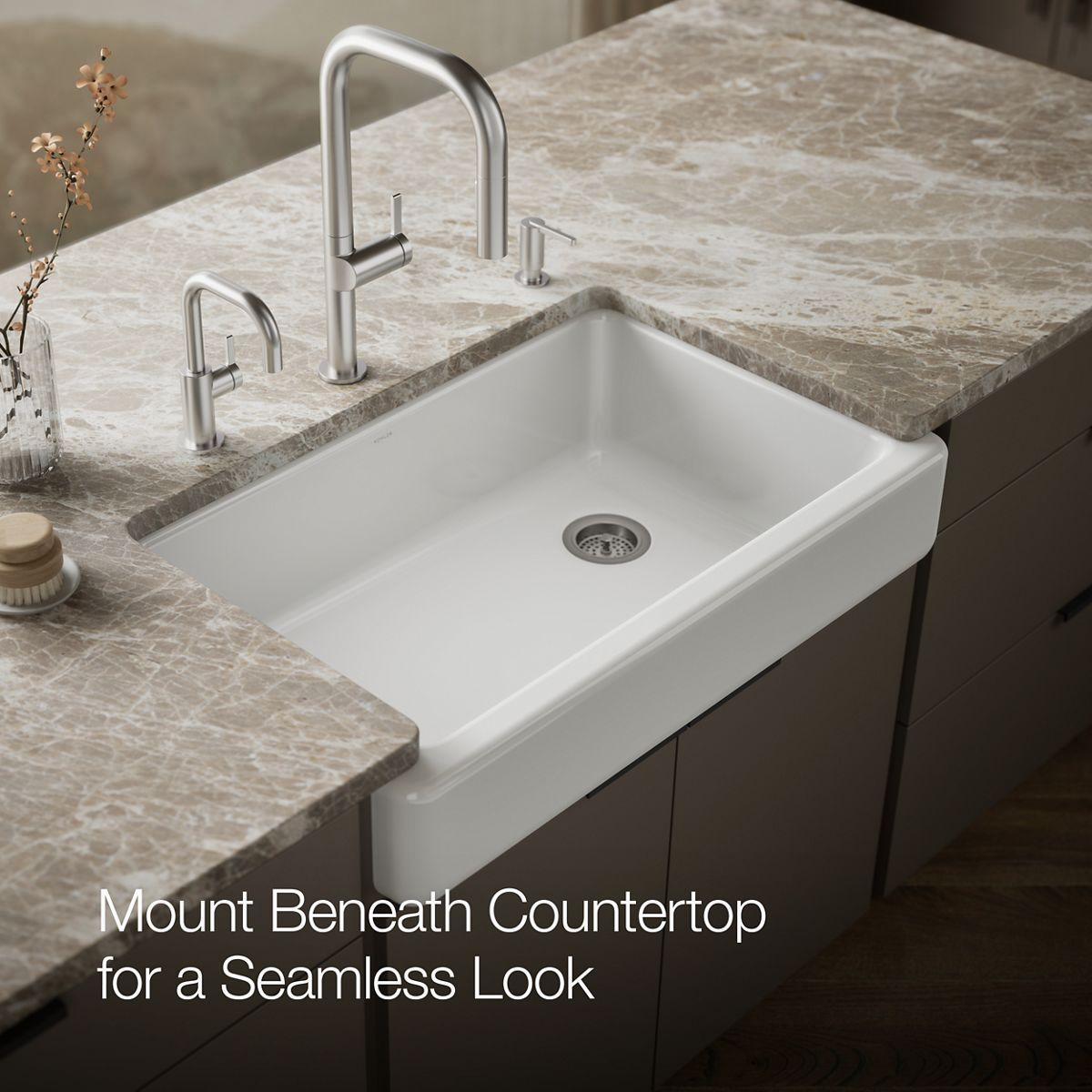 The Whitehaven apron-front kitchen sink features a streamlined and versatile farmhouse style to complement any decor. Perfect for remodeling projects, it has a shortened apron that allows for installation on most new or existing 36-inch standard cabinetry. The Self-Trimming design requires only a simple rough cut, overlapping the cabinet face for beautiful results and easy installation. A large single basin accommodates large pots and pans, while the sloped bottom helps with draining and cleanup. Crafted from enameled cast iron, this sink resists chipping, cracking, or burning for years of beauty and reliable performance.