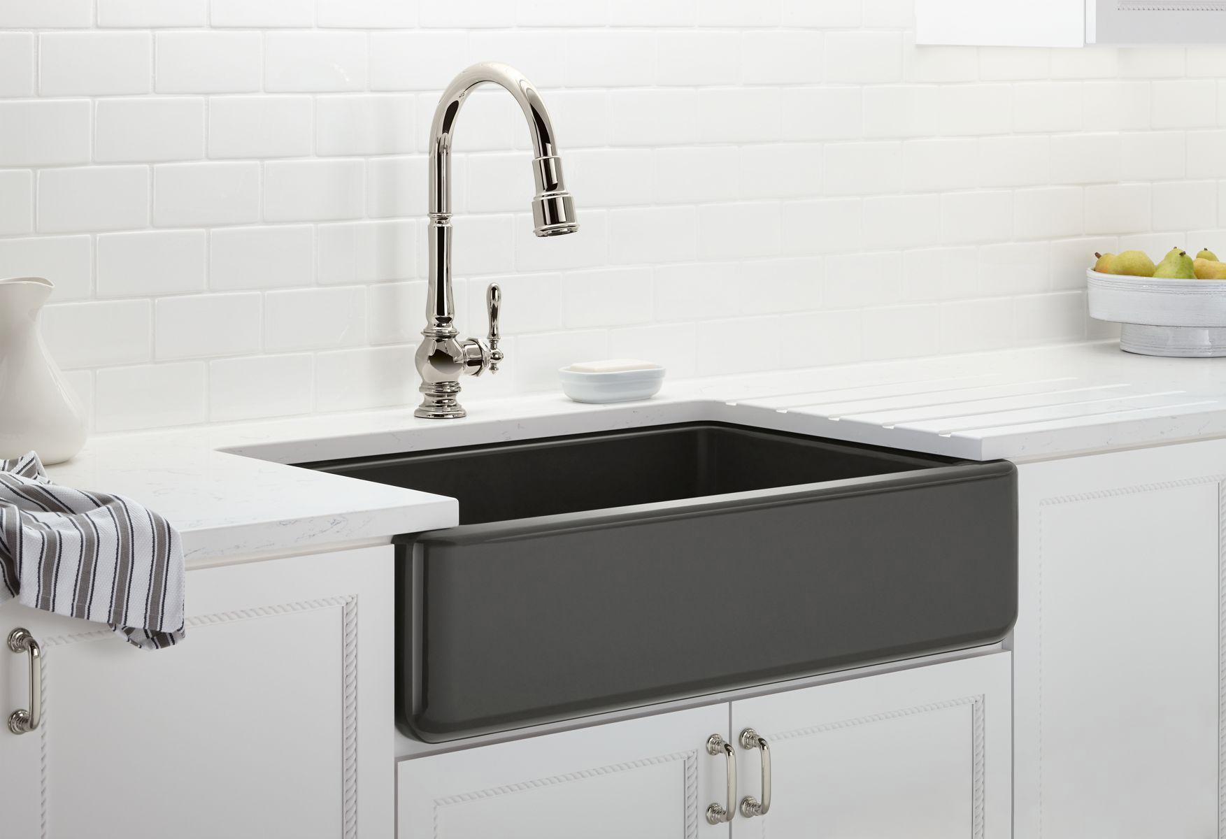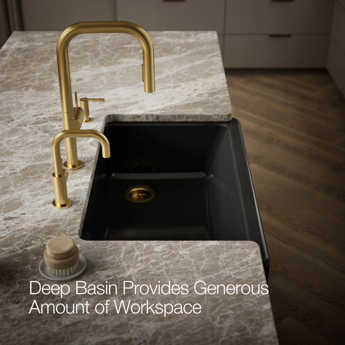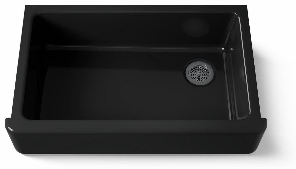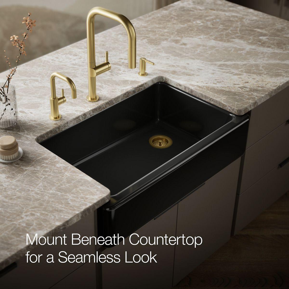 The Whitehaven apron-front kitchen sink features a streamlined and versatile farmhouse style to complement any decor. A large single basin accommodates large pots and pans, while the sloped bottom helps with draining and cleanup. Crafted from enameled cast iron, this sink resists chipping, cracking, or burning for years of beauty and reliable performance. A standard apron front makes it easy to install on 36-inch apron-front cabinetry. The Self-Trimming design requires only a simple rough cut, overlapping the cabinet face for beautiful results.
