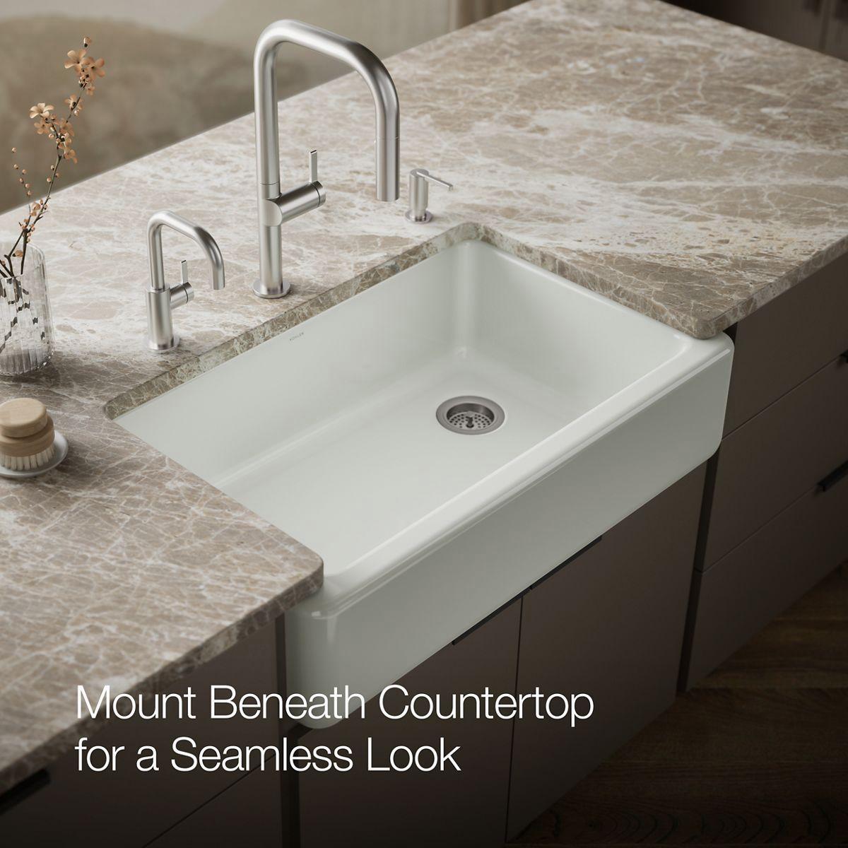 The Whitehaven apron-front kitchen sink features a streamlined and versatile farmhouse style to complement any decor. A large single basin accommodates large pots and pans, while the sloped bottom helps with draining and cleanup. Crafted from enameled cast iron, this sink resists chipping, cracking, or burning for years of beauty and reliable performance. A standard apron front makes it easy to install on 36-inch apron-front cabinetry. The Self-Trimming design requires only a simple rough cut, overlapping the cabinet face for beautiful results.