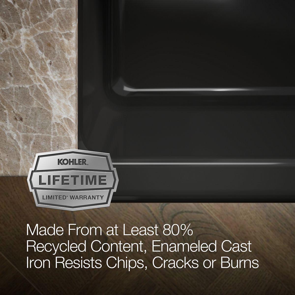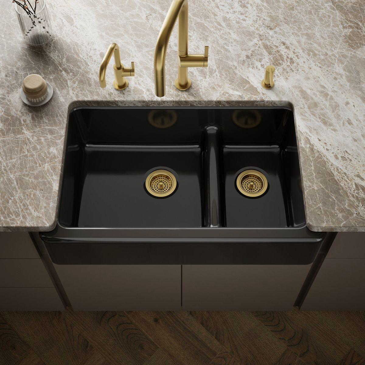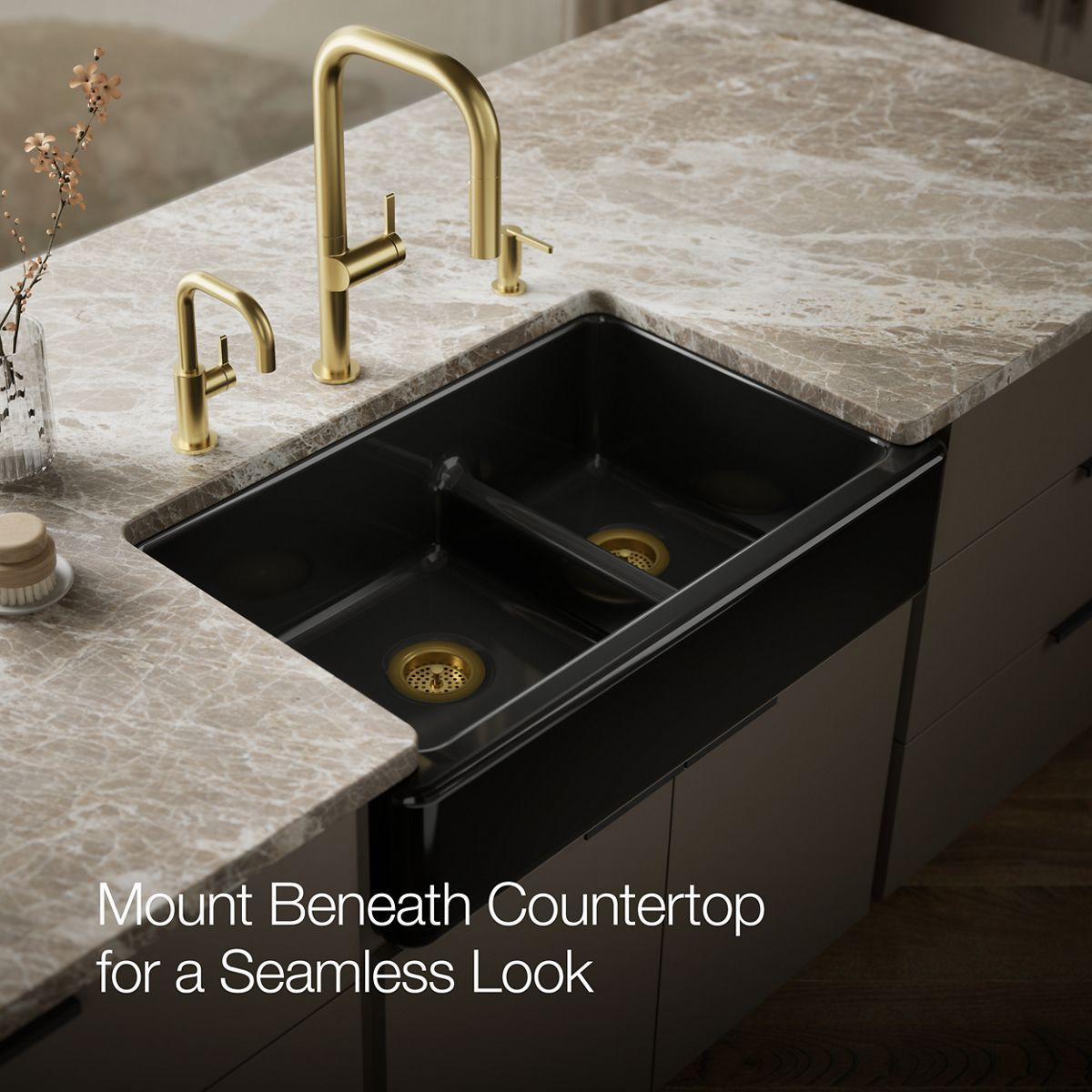 The Whitehaven apron-front kitchen sink features a streamlined and versatile farmhouse style to complement any decor. The Self-Trimming design requires only a simple rough cut, overlapping the cabinet face for beautiful results. The sink is designed to fit in most standard 36-inch apron-front cabinetry. A low barrier divides the two compartments, making it easy to wash and rinse large items while still keeping the two basins separate. Crafted from enameled cast iron, this sink resists chipping, cracking, or burning for years of beauty and reliable performance.