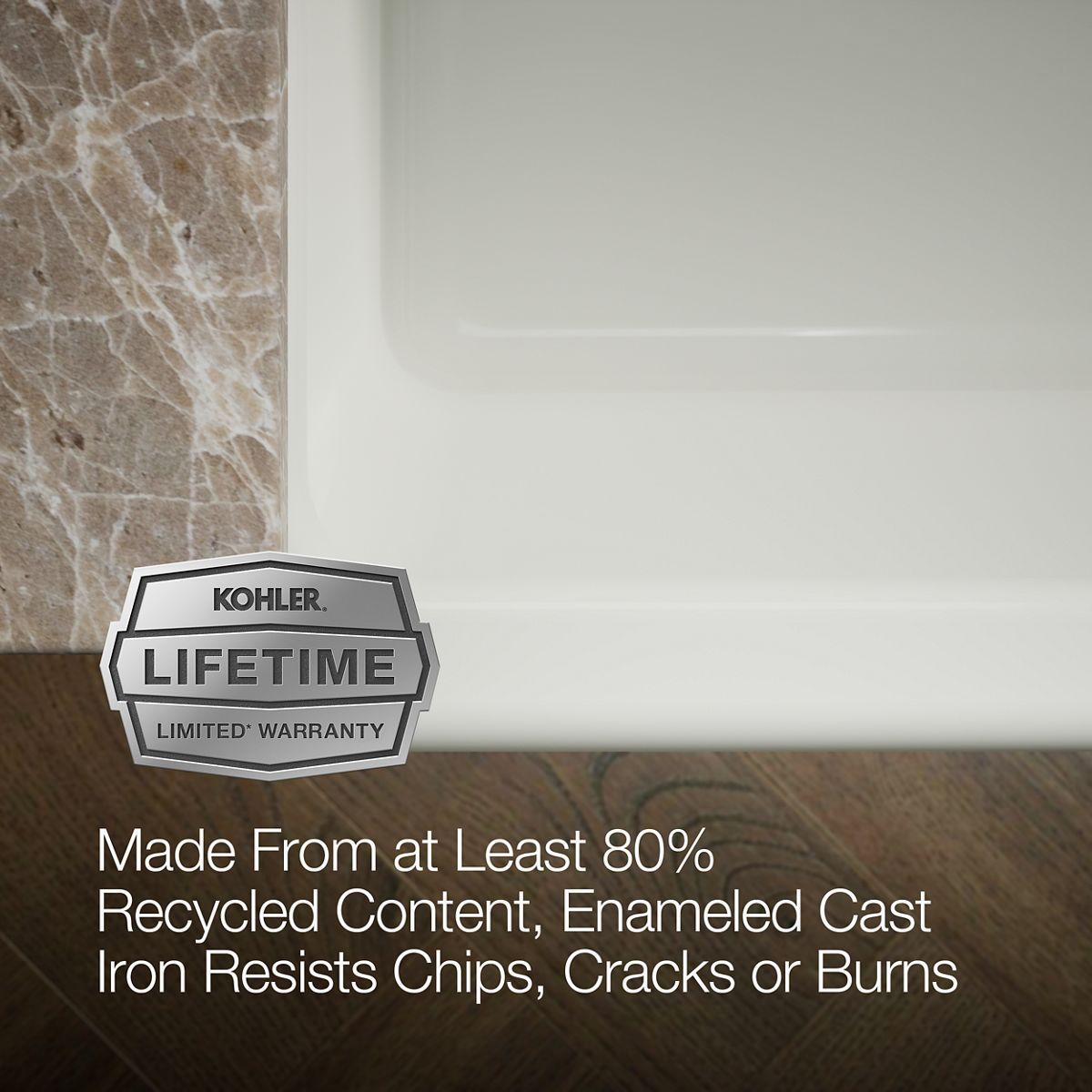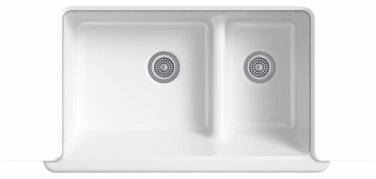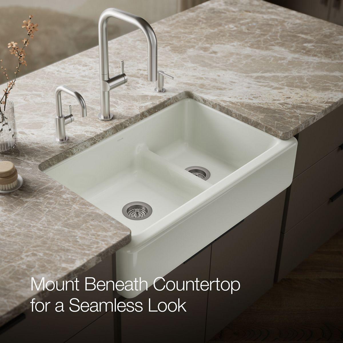 The Whitehaven apron-front kitchen sink features a streamlined and versatile farmhouse style to complement any decor. The Self-Trimming design requires only a simple rough cut, overlapping the cabinet face for beautiful results. The sink is designed to fit in most standard 36-inch apron-front cabinetry. A low barrier divides the two compartments, making it easy to wash and rinse large items while still keeping the two basins separate. Crafted from enameled cast iron, this sink resists chipping, cracking, or burning for years of beauty and reliable performance.