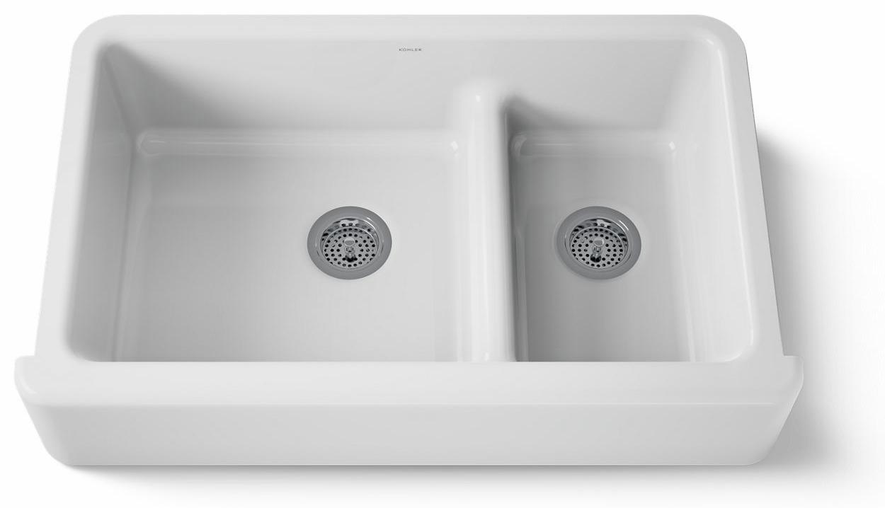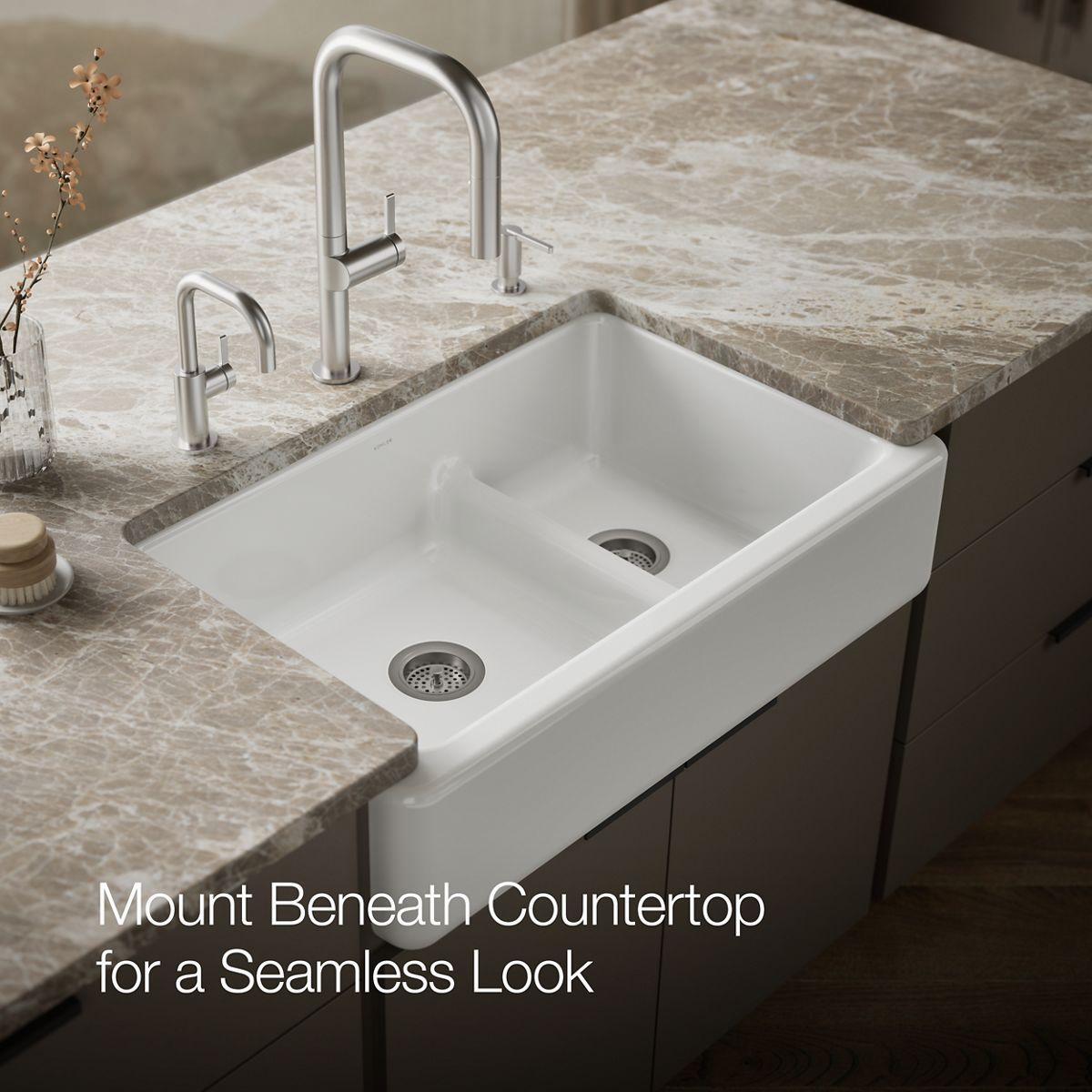 The Whitehaven apron-front kitchen sink features a streamlined and versatile farmhouse style to complement any decor. The Self-Trimming® design requires only a simple rough cut, overlapping the cabinet face for beautiful results. The sink is designed to fit in most standard 36-inch apron-front cabinetry. A low barrier divides the two compartments, making it easy to wash and rinse large items while still keeping the two basins separate. Crafted from enameled cast iron, this sink resists chipping, cracking, or burning for years of beauty and reliable performance.