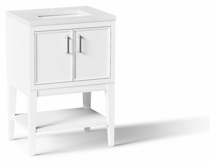 Timeless, simplistic pieces updated for the modern home, Winnow bathroom cabinets are at once familiar and different. Optional tall, tapered legs and symmetrical design are recognizably Shaker, while beveled door and drawer fronts and hardware with rounded corners deliver fresh details. The perfect balance of classic, elegant, and versatile, Winnow vanities come to life when you select your cabinet color. Cabinet, countertop, sink, legs, shelf, and Vibrant® Brushed Nickel hardware are included with the set, which is ready for self-assembly on legs or wall. Additional hardware finishes are also available.