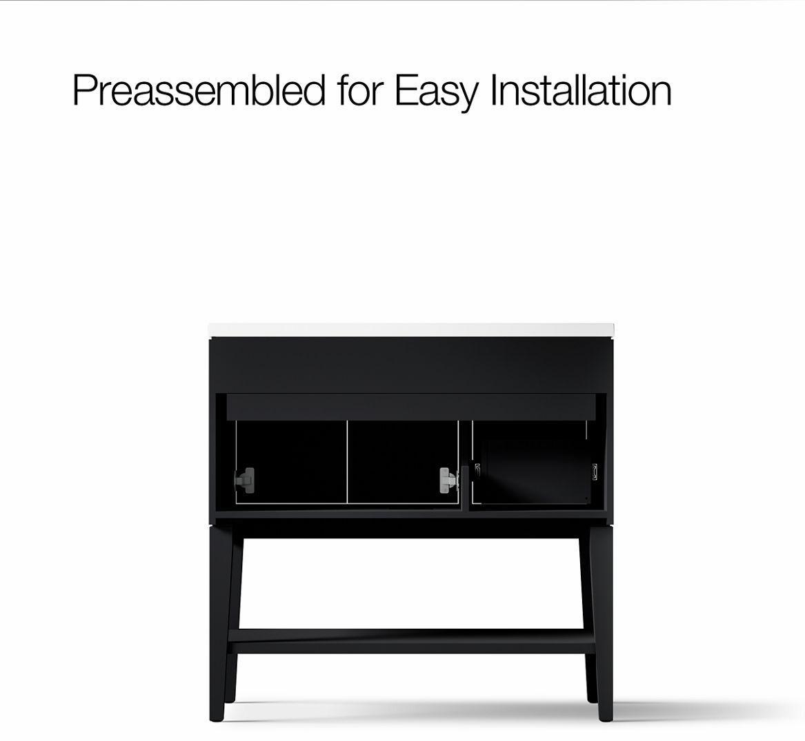 - Set includes cabinet, precut quartz vanity top, sink, optional tall legs and shelf, and cabinet hardware.