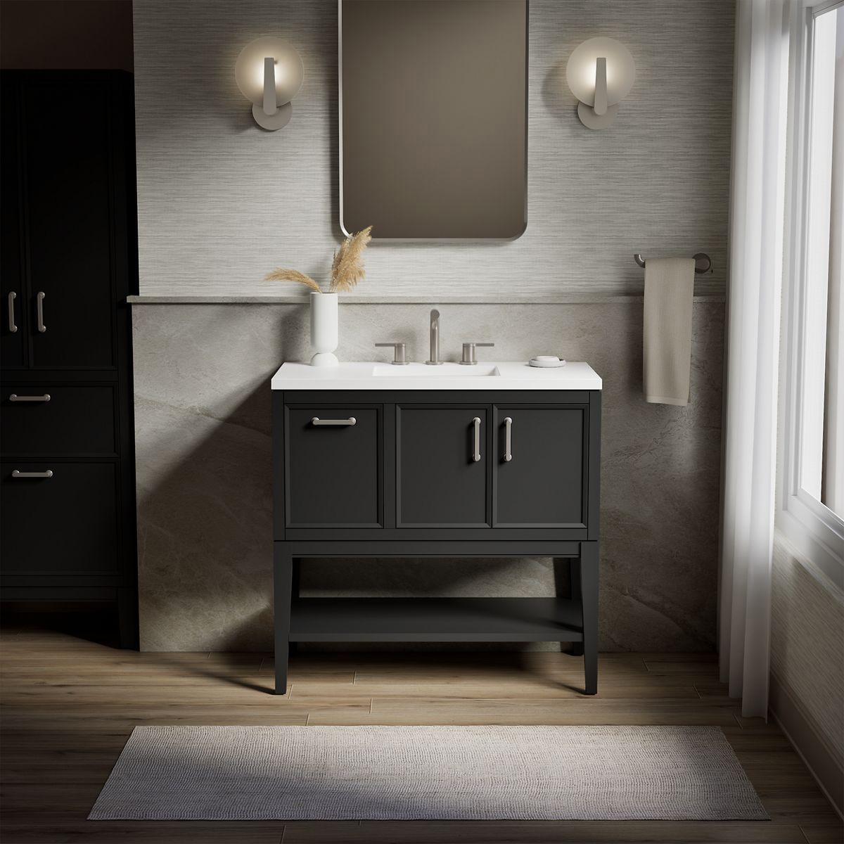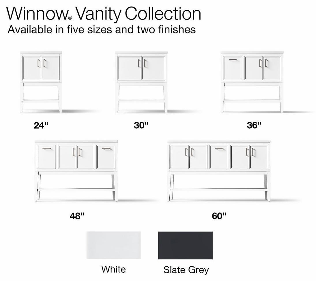Timeless, simplistic pieces updated for the modern home, Winnow bathroom cabinets are at once familiar and different. Optional tall, tapered legs and symmetrical design are recognizably Shaker, while beveled door and drawer fronts and hardware with rounded corners deliver fresh details. The perfect balance of classic, elegant, and versatile, Winnow vanities come to life when you select your cabinet color. Cabinet, countertop, sink, legs, shelf, and Vibrant Brushed Nickel hardware are included with the set, which is ready for self-assembly on legs or wall. Additional hardware finishes are also available.